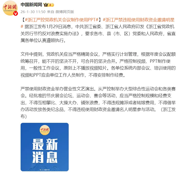 据中国新闻网:浙江发布1月29日消息,中共浙江省委、浙江省人民政府印发《浙江省党政机关厉行节约反对浪费实施办法》,要求各市、县(市、区)党委和人民政府,省直属各单位认真遵照执行。