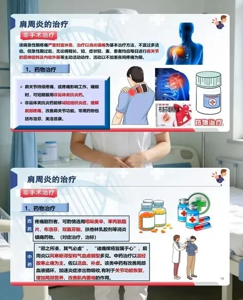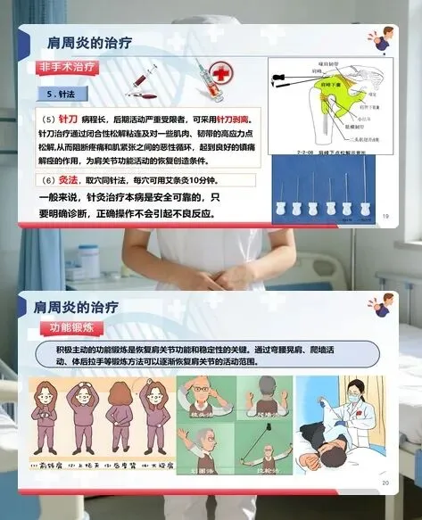 导致肩周炎的原因是 “内外夹击”:外部有长期劳损、寒冷刺激和肩部外伤,内部则与肝肾亏损、气血不足、软组织老化相关。治疗上,急性期以消炎镇痛为主,可服用布洛芬等非甾体类抗炎药;缓解期则需配合物理治疗、针灸推拿、关节腔注射等方式。臂丛阻滞加手法松解术安全见效快,而针刀治疗能有效松解粘连,为功能恢复创造条件。更重要的是坚持功能锻炼,弯腰晃肩、爬墙活动、体后拉手等动作,能逐步恢复关节灵活性。