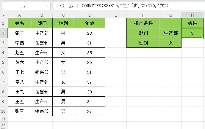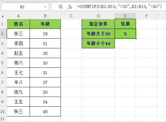 =COUNTIFS(B2:B10,">30",B2:B10,"<40")👉 场景3:多列多条件(不同列分别满足条件)