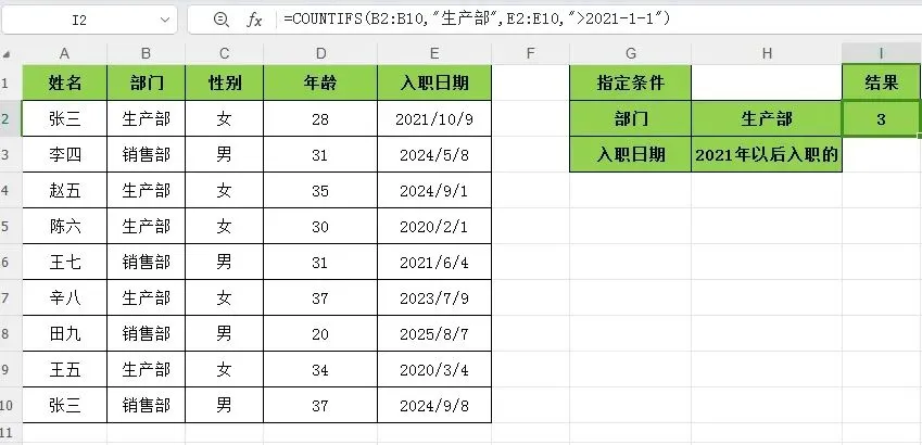 =COUNTIFS(B2:B10,"生产部",C2:C10,"女")=COUNTIFS(B2:B10,"生产部",E2:E10,">2021-1-1")✅ 关键点:不同列对应不同区域,条件区域大小必须一致今天的COUNTIFS核心用法就到这啦,都是日常办公最常用的写法,直接抄公式就能用!有遗漏的场景、不懂的问题,欢迎在留言区补充交流,一起把Excel计数函数学扎实~