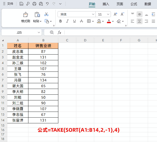 工作中常需先排序再提取,例如:按“销售业绩”降序排列后取前3名。=TAKE(SORT(A1:B14,2,-1),4)📌 注意:因包含表头,取前3名实际需提取4行数据。