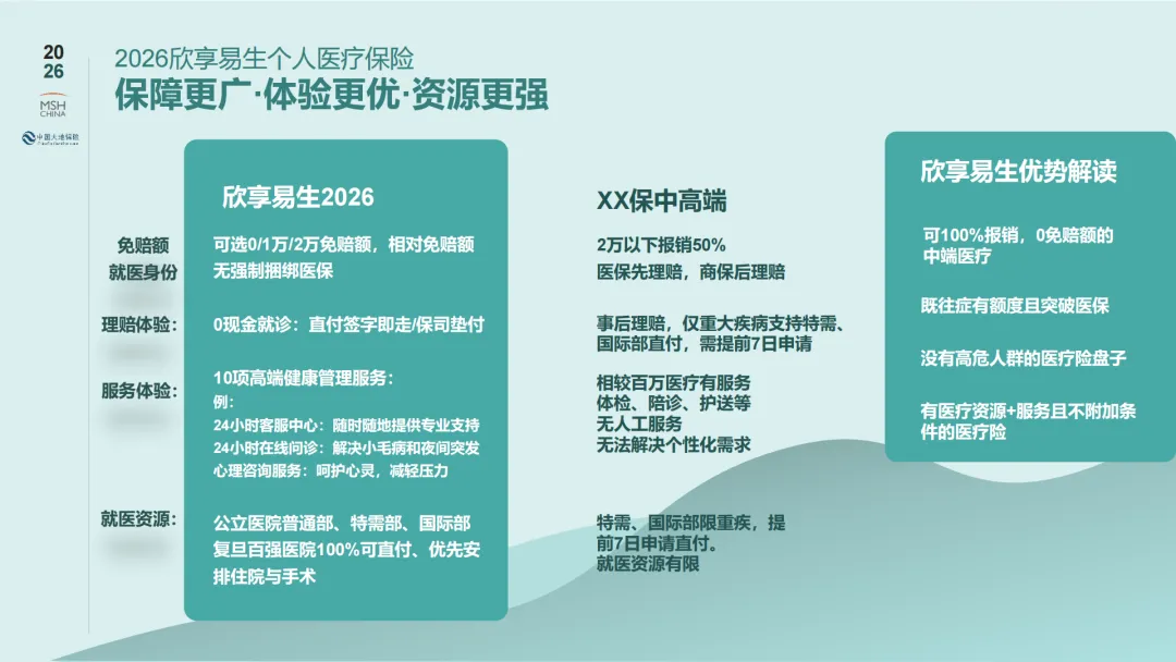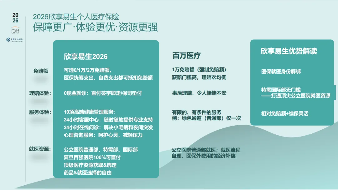在此背景下,中国大地保险联合MSH推出的欣享易生2026个人医疗保险,以“保障更广、体验更优、资源更强”的核心优势,成为连接普通消费者与顶尖医疗资源的重要桥梁。