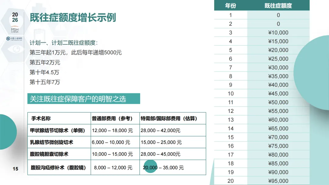 4.既往症逐步覆盖:这是产品的一大亮点。市面上多数医疗险将高血压、糖尿病、结节等既往症除外,而欣享易生2026规定,未间断投保第三年起,既往症可获得1万元赔付额度,此后每年增加5000元,第十五年可达7万元,第二十年更是高达9.5万元,彻底解决了有基础疾病人群的保障痛点。
