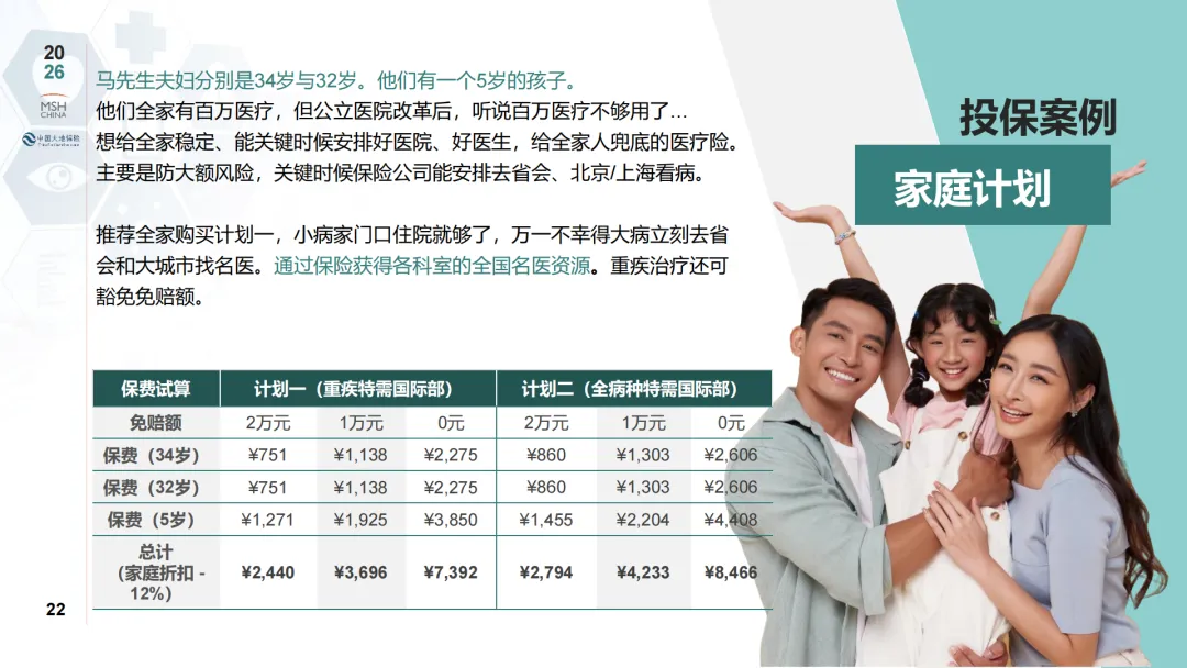 对于有孩子的家庭,医疗保障需要兼顾全家不同年龄段的需求。34岁的马先生夫妇和5岁的孩子,原有百万医疗但无法满足公立医院改革后的高端医疗需求,希望获得稳定的医院和医生资源。选择全家投保计划一,小病可在本地住院治疗,大病能直接对接省会或北京、上海的名医资源,重疾治疗豁免免赔额,家庭投保还能享受折扣优惠,用合理预算为全家筑牢医疗保障防线。