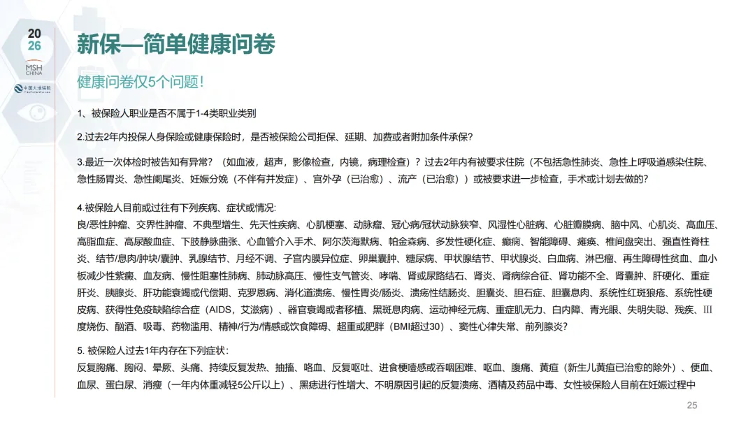 1.健康告知更简单:仅需回答5个健康问题,相比同类产品7条左右的健康告知,门槛更低,减少了投保时的繁琐流程。