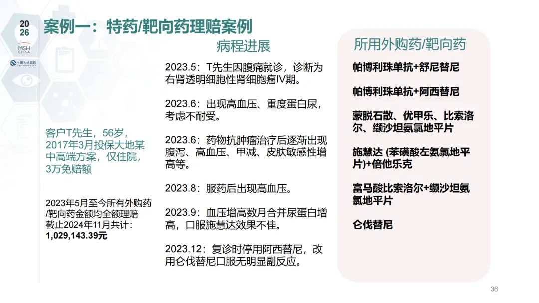 1.特药/靶向药全额理赔:56岁的T先生投保后确诊右肾透明细胞性肾细胞癌IV期,后续使用帕博利珠单抗、仑伐替尼等多款外购药和靶向药,截至2024年11月,相关费用累计102.9万元均全额理赔,让患者无需为高昂药费担忧,能持续接受有效治疗;