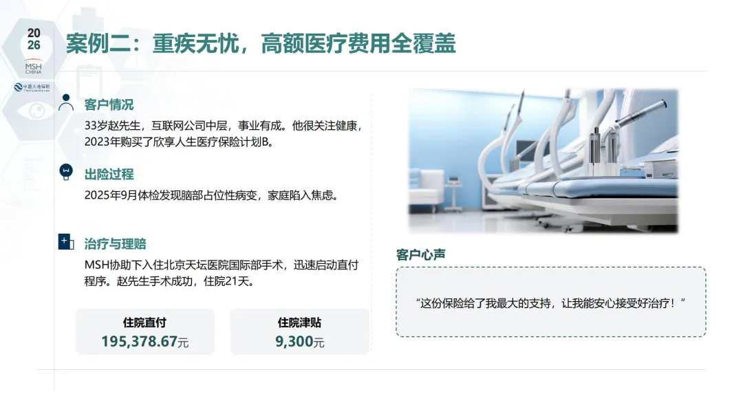 2.重疾直付,高效就医:33岁的赵先生体检发现脑部占位性病变,在MSH协助下入住北京天坛医院国际部手术,启动直付程序,住院21天的19.5万元费用直接由保险公司与医院结算,还获得9300元住院津贴,让患者和家人能安心应对疾病,无需分心费用问题;