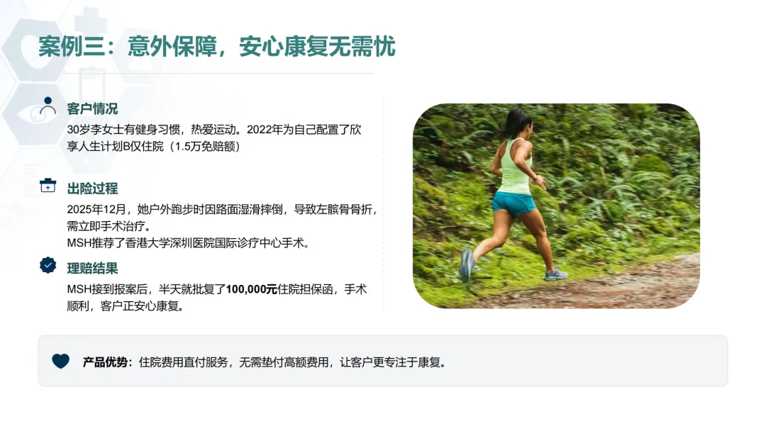 3.意外保障,快速响应:30岁的李女士跑步时摔倒导致左髌骨骨折,MSH接到报案后半天内批复10万元住院担保函,推荐香港大学深圳医院国际诊疗中心手术,直付服务让她无需垫付高额费用,专注康复。