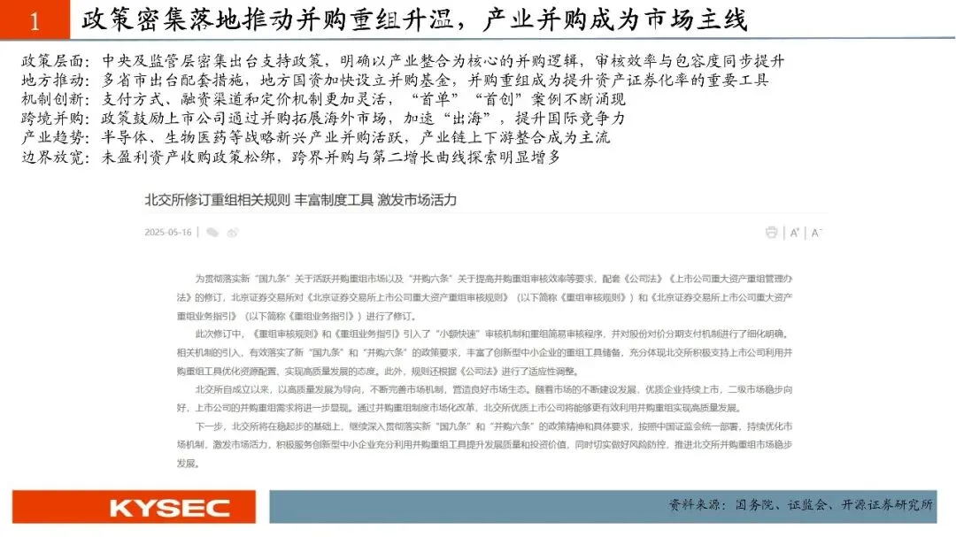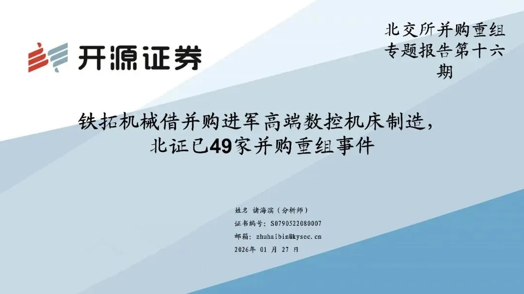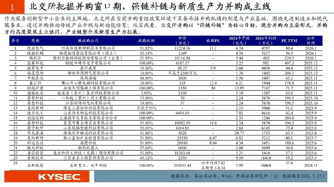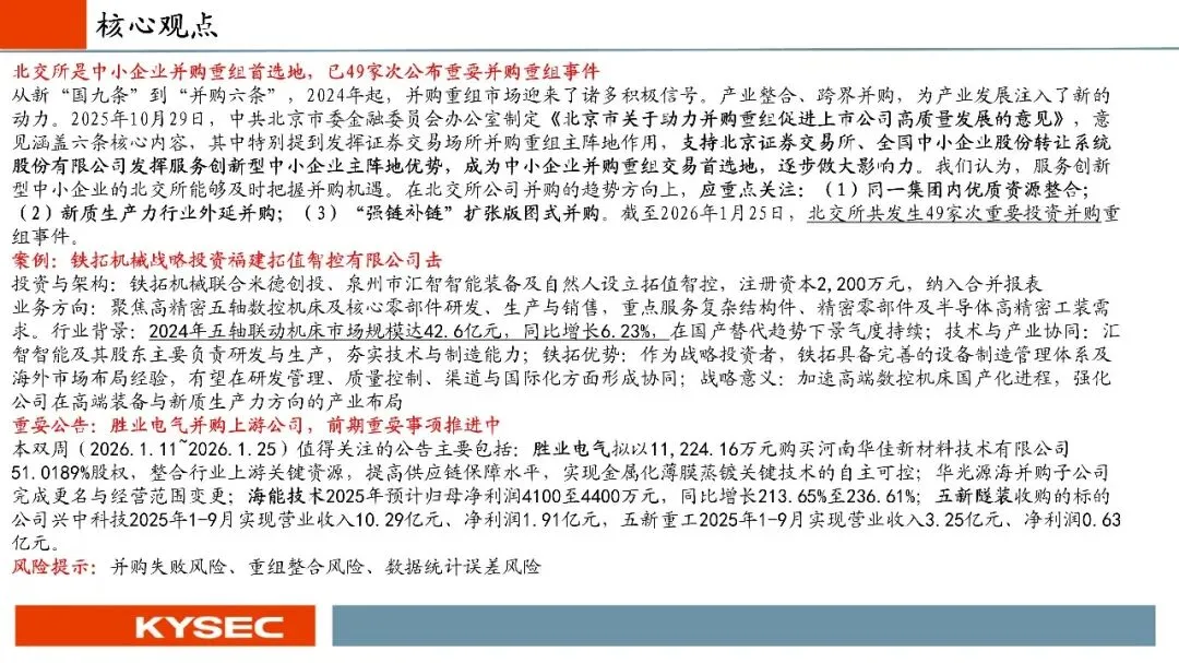 从新“国九条”到“并购六条”,2024年起,并购重组市场迎来了诸多积极信号。产业整合、跨界并购,为产业发展注入了新的动力。2025年10月29日,中共北京市委金融委员会办公室制定《北京市关于助力并购重组促进上市公司高质量发展的意见》,意见涵盖六条核心内容,其中特别提到发挥证券交易场所并购重组主阵地作用,支持北京证券交易所、全国中小企业股份转让系统股份有限公司发挥服务创新型中小企业主阵地优势,成为中小企业并购重组交易首选地,逐步做大影响力。我们认为,服务创新型中小企业的北交所能够及时把握并购机遇。在北交所公司并购的趋势方向上,应重点关注:(1)同一集团内优质资源整合;(2)新质生产力行业外延并购;(3)“强链补链”扩张版图式并购。截至2026年1月25日,北交所共发生49家次重要投资并购重组事件。