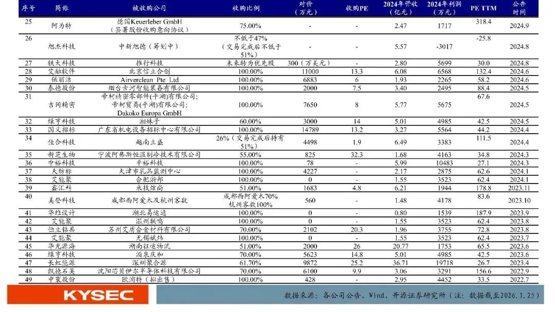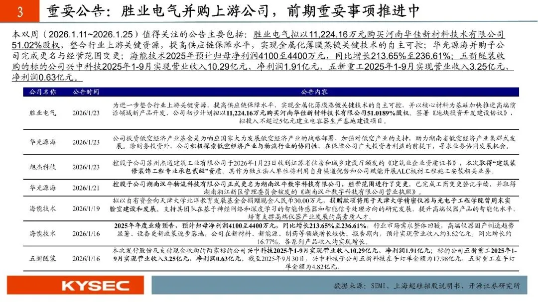 本双周(2026.1.11~2026.1.25)值得关注的公告主要包括:胜业电气拟以11,224.16万元购买河南华佳新材料技术有限公司51.0189%股权,整合行业上游关键资源,提高供应链保障水平,实现金属化薄膜蒸镀关键技术的自主可控;华光源海并购子公司完成更名与经营范围变更;海能技术2025年预计归母净利润4100至4400万元,同比增长213.65%至236.61%;五新隧装收购的标的公司兴中科技2025年1-9月实现营业收入10.29亿元、净利润1.91亿元,五新重工2025年1-9月实现营业收入3.25亿元、净利润0.63亿元。
