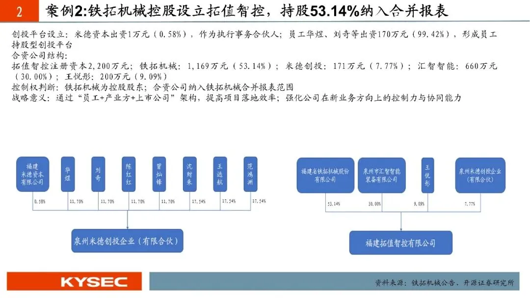 投资与架构:铁拓机械联合米德创投、泉州市汇智智能装备及自然人设立拓值智控,注册资本2,200万元,纳入合并报表