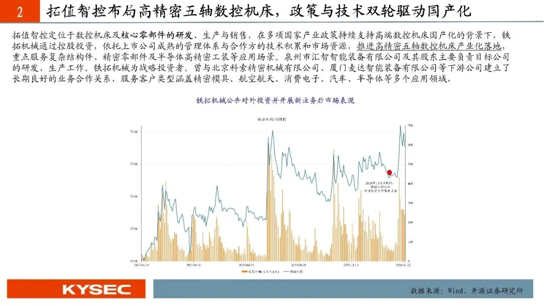 业务方向:聚焦高精密五轴数控机床及核心零部件研发、生产与销售,重点服务复杂结构件、精密零部件及半导体高精密工装需求。行业背景:2024年五轴联动机床市场规模达42.6亿元,同比增长6.23%,在国产替代趋势下景气度持续;技术与产业协同:汇智智能及其股东主要负责研发与生产,夯实技术与制造能力;铁拓优势:作为战略投资者,铁拓具备完善的设备制造管理体系及海外市场布局经验,有望在研发管理、质量控制、渠道与国际化方面形成协同;战略意义:加速高端数控机床国产化进程,强化公司在高端装备与新质生产力方向的产业布局