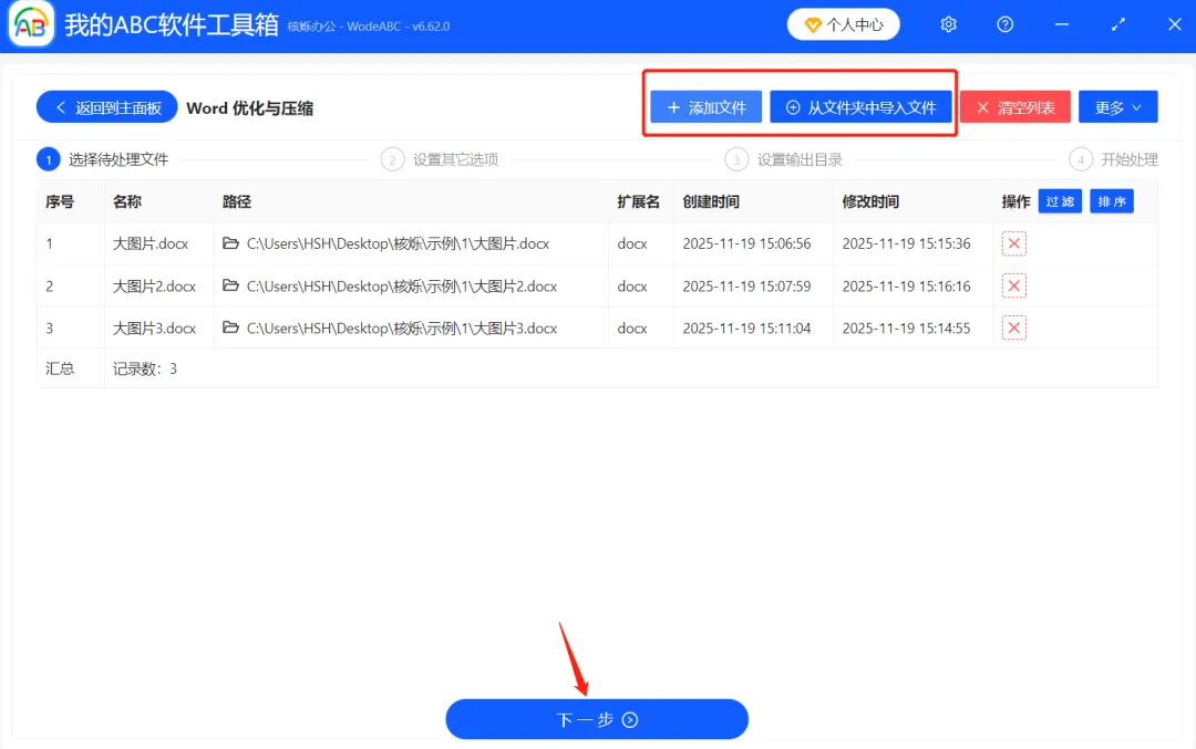第二步:将需要缩小的文档导入到操作面板中,可以点击右上角的【添加文件】或者【从文件夹中导入文件】,也支持一键将Word文档拖拽到处理框中,按照自己的喜好进行操作即可,然后接着点击【下一步】。