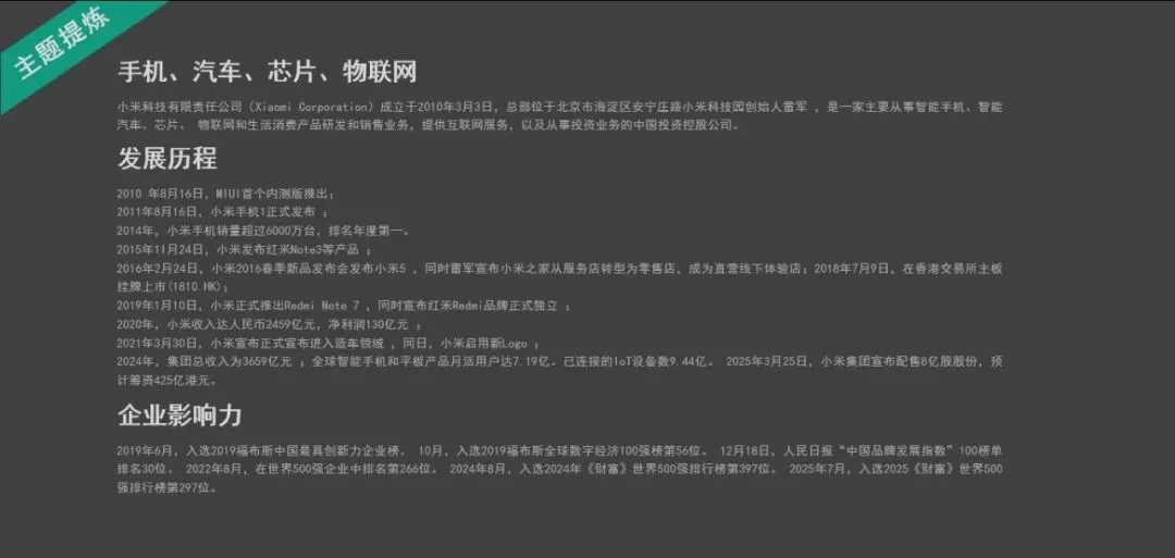 直接排版布局大体就是上面几种。当然这里说的主要是纯文字排版。对于某些可以转化成另一种形式又不丢失文字的情况,同样可以用上,比如,文本介绍中的企业历程,我们就可以将其转化成一条时间线,时间线容积较大、文字基本全能容纳。