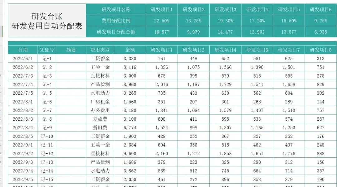 多项目研发投入自动分摊,直接生成费用占比分析图