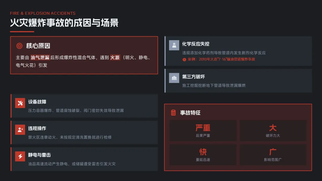 2010.7.16 大连中石油国际储运“7·16”爆炸火灾,服务商违规加注过量脱硫化氢剂,引发放热反应致管道爆炸,原油泄漏入海并起火;1人失踪、1人受伤,灭火中1名消防战士牺牲,直接损失2.2亿元。