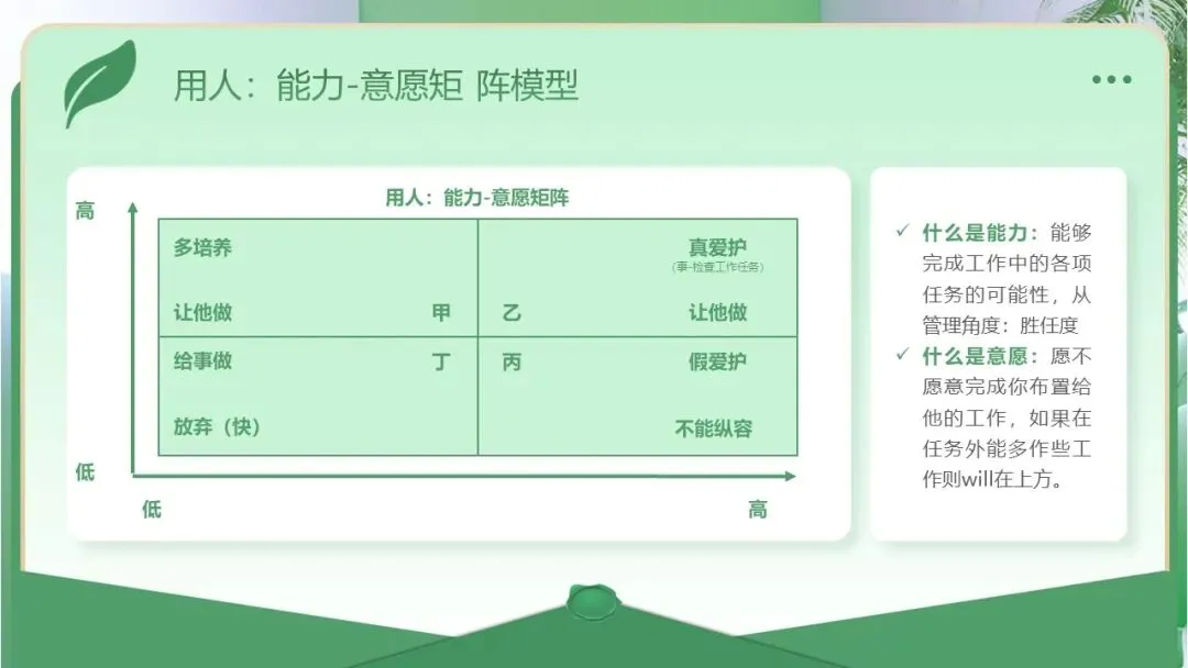 中层管理者需掌握“能力-意愿矩阵”工具,根据下属的能力高低与工作意愿,采取差异化的管理策略,实现“人岗适配、人尽其才”。