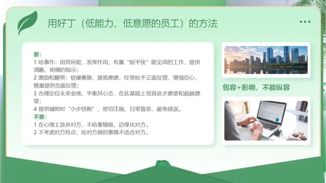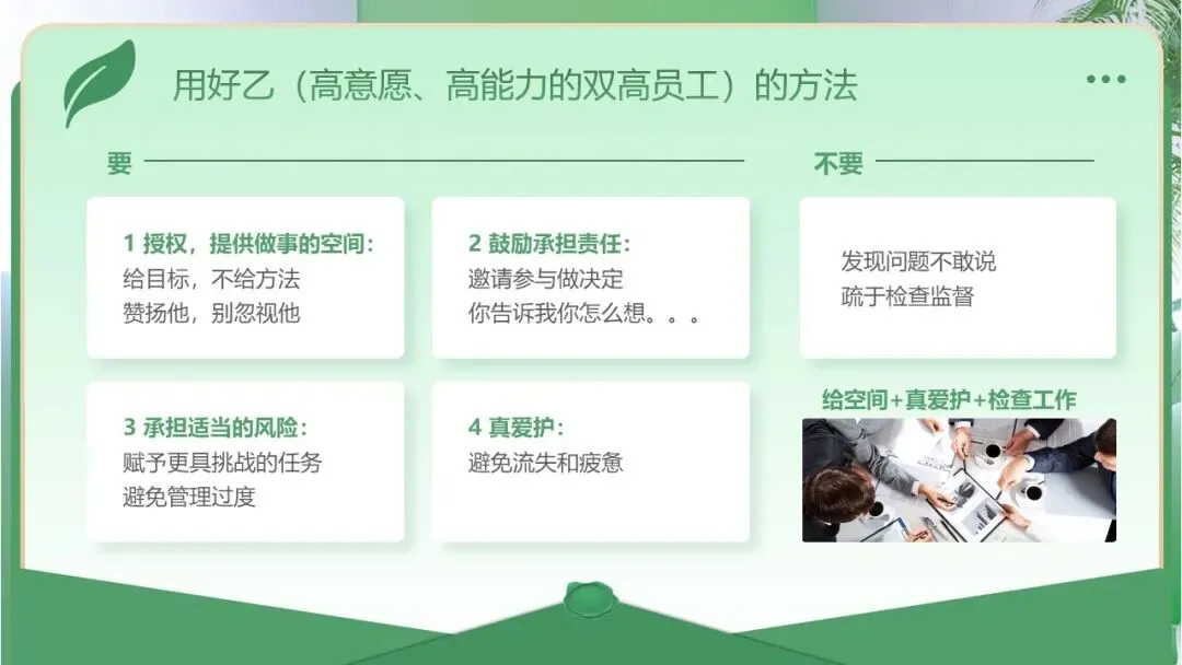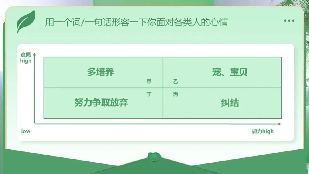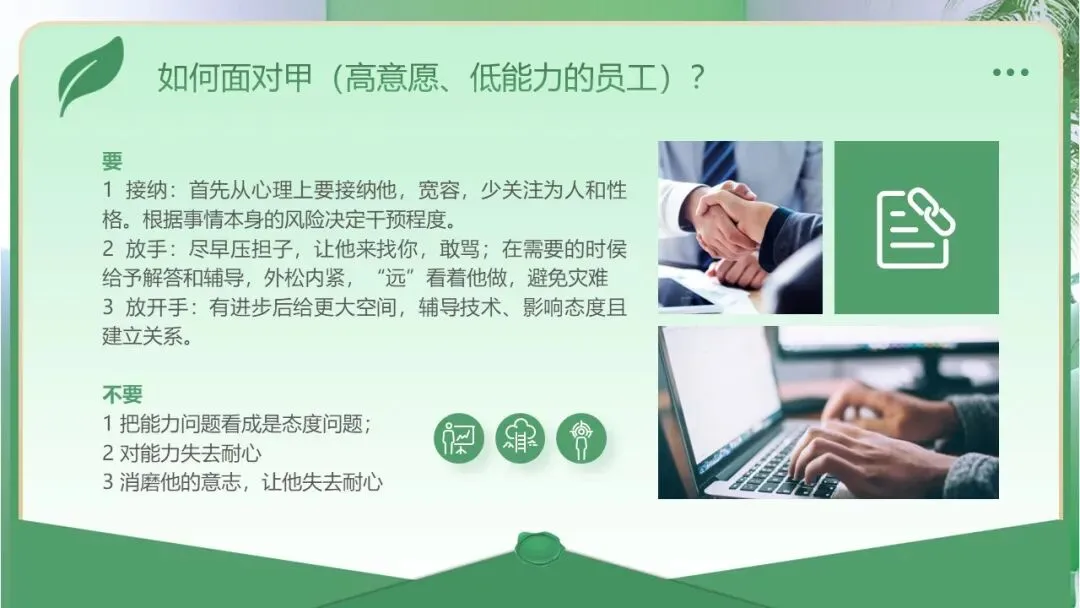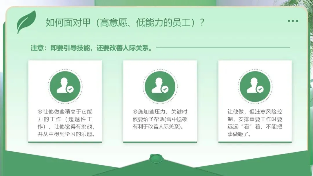 高意愿、低能力:这类员工态度积极、乐于成长,但专业能力不足。管理重点是“包容引导、逐步赋能”,接纳其初期的不足,安排“跳一跳够得着”的挑战性工作,关键时给予具体指导和帮助,通过导师带教、专项培训等方式,逐步提升其能力,同时给予及时反馈,增强其信心,逐步授权让其独立承担工作。