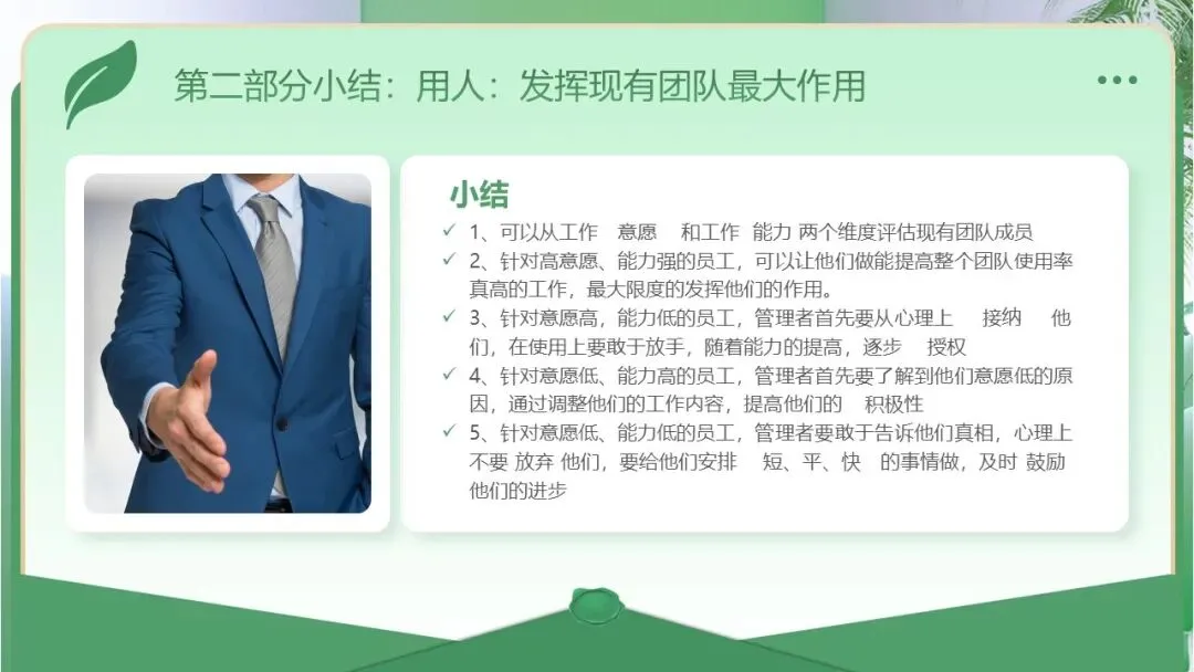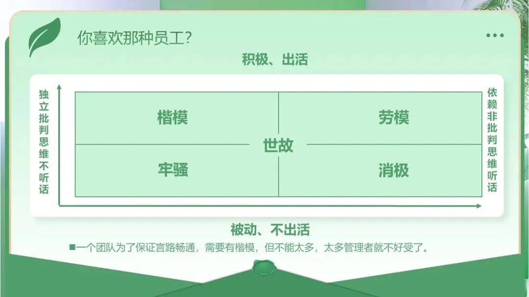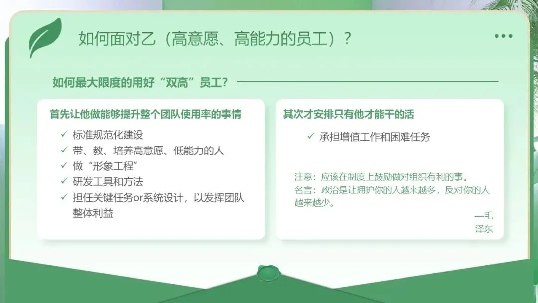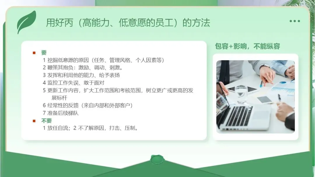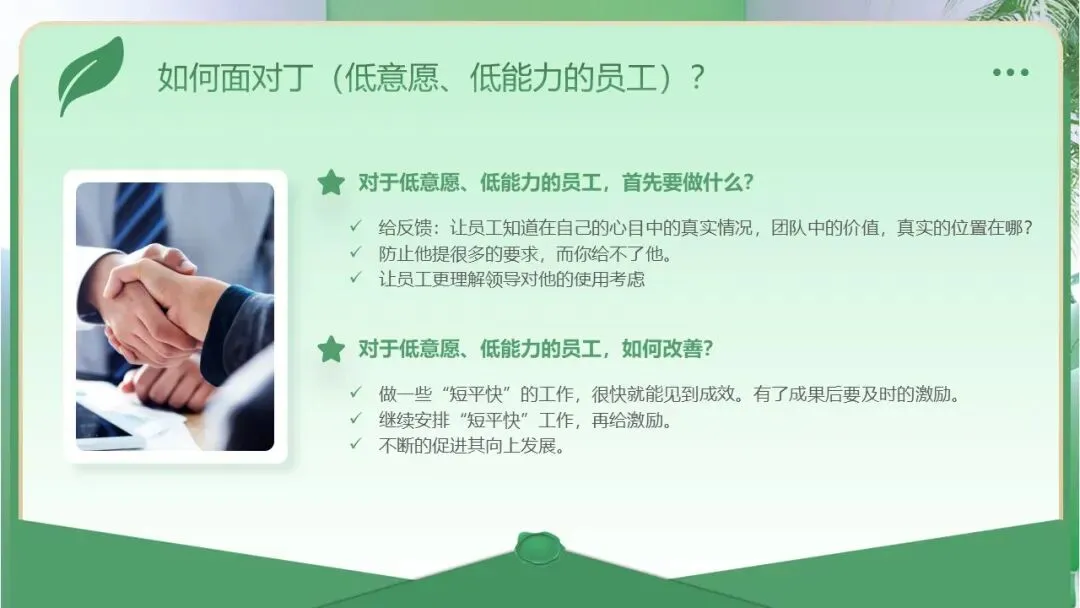 高意愿、低能力:这类员工态度积极、乐于成长,但专业能力不足。管理重点是“包容引导、逐步赋能”,接纳其初期的不足,安排“跳一跳够得着”的挑战性工作,关键时给予具体指导和帮助,通过导师带教、专项培训等方式,逐步提升其能力,同时给予及时反馈,增强其信心,逐步授权让其独立承担工作。