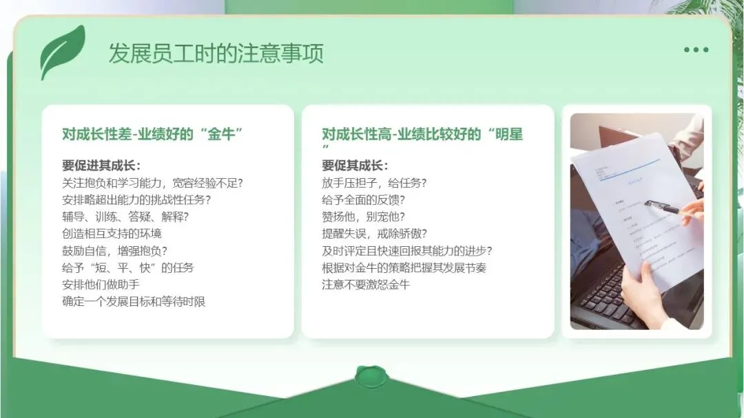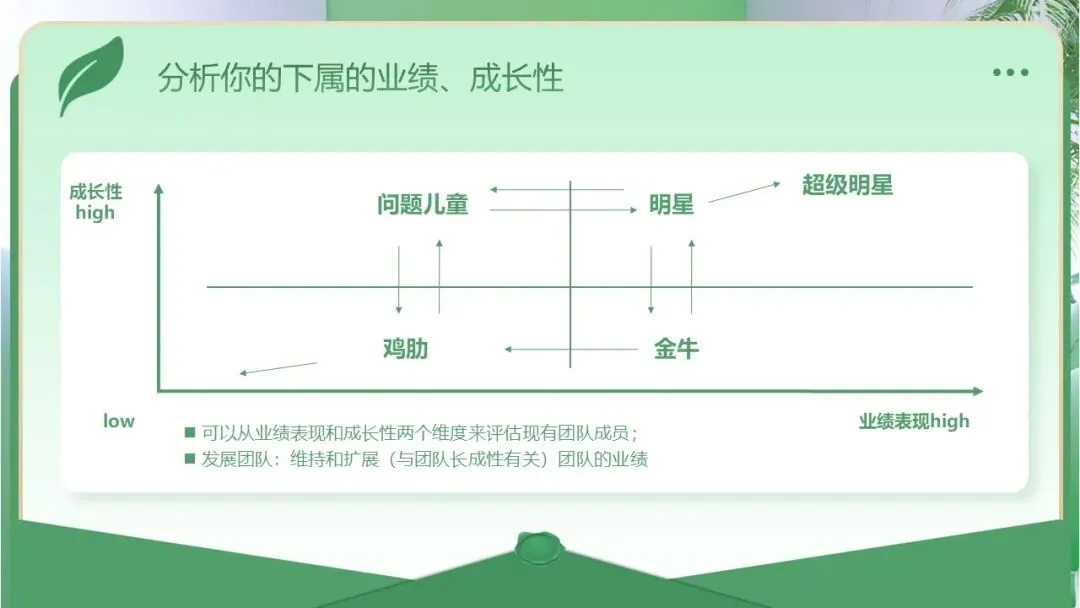 人才培养方面,要建立“差异化培养体系”,结合员工的能力和成长性,将员工分为明星、金牛、问题儿童、鸡肋四类,采取不同的培养策略: