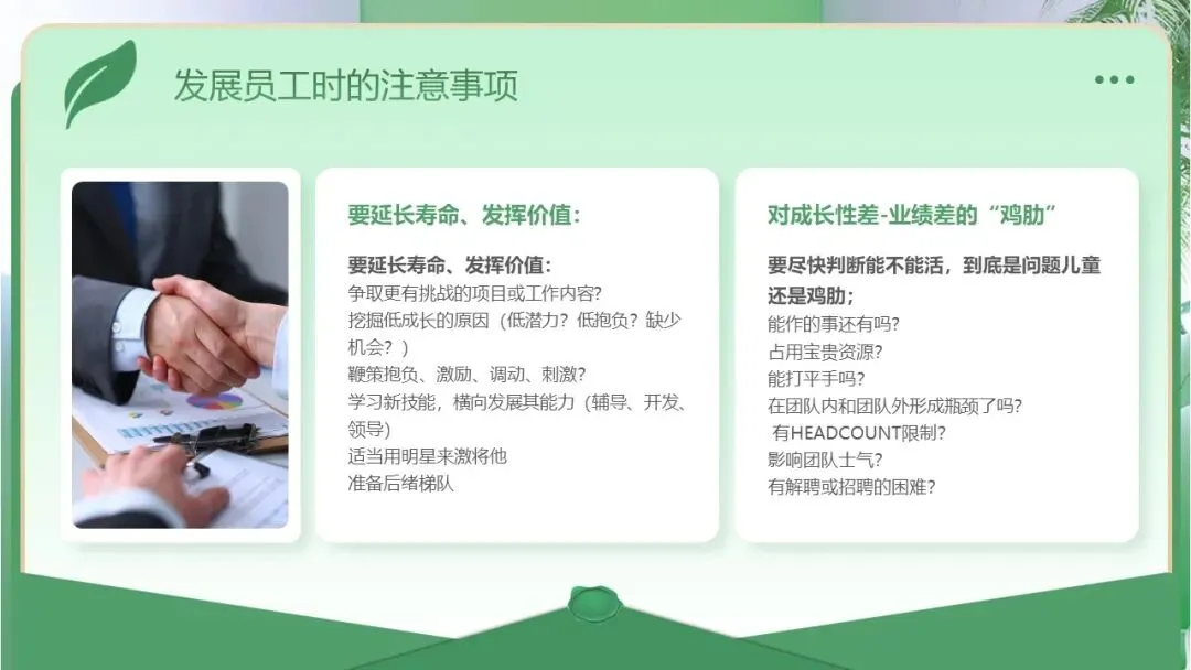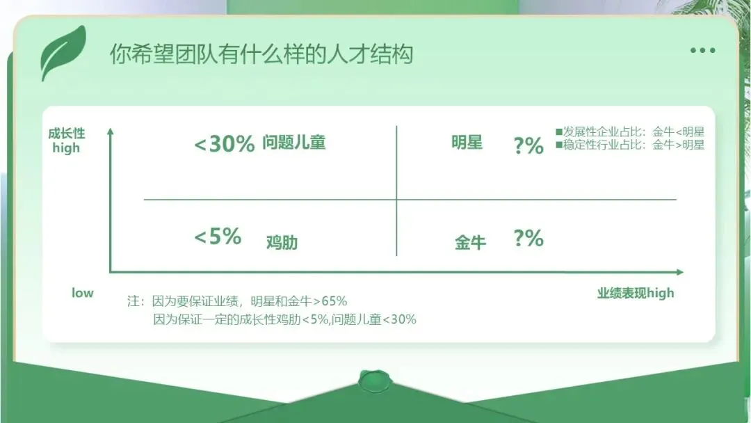 对明星员工压担子、给反馈,重点培养其领导力;对金牛员工激发成长意愿,鼓励其突破舒适区;对问题儿童关注潜力,针对性提升其能力;对鸡肋员工快速判断价值,及时调整或优化,确保团队人才结构合理,控制鸡肋员工占比低于5%、问题儿童占比低于30%。