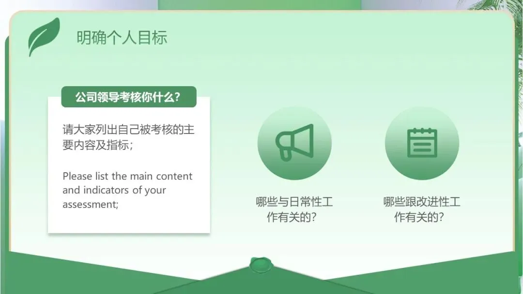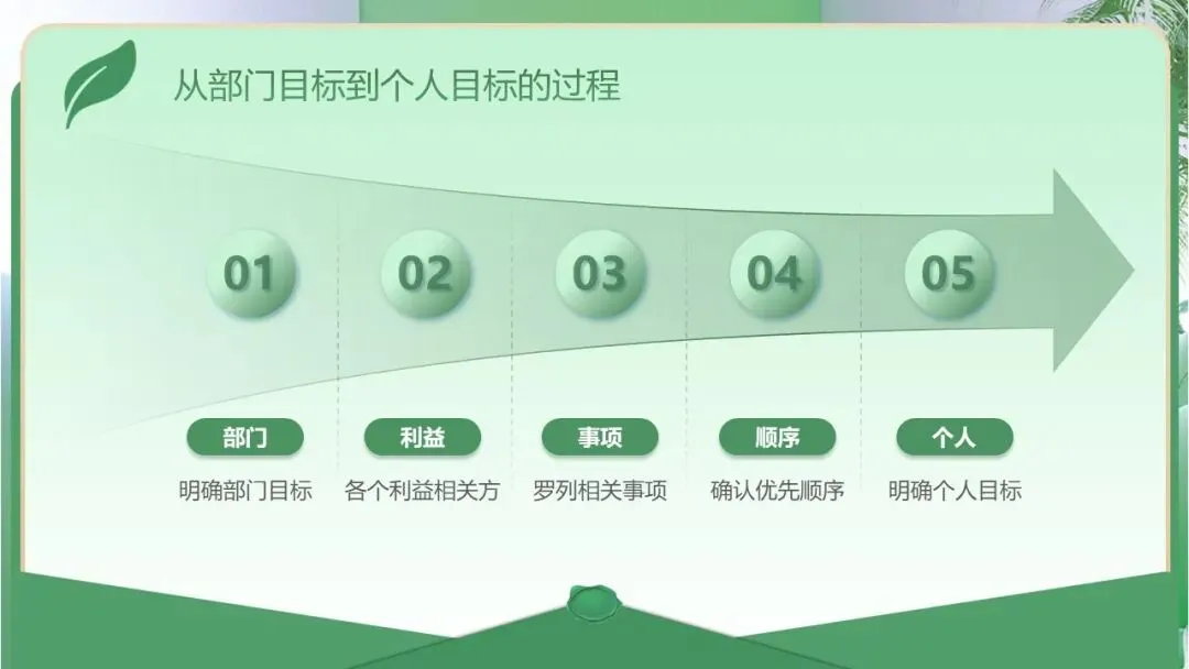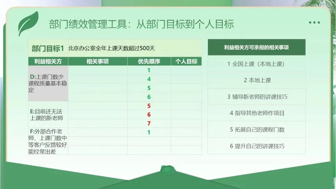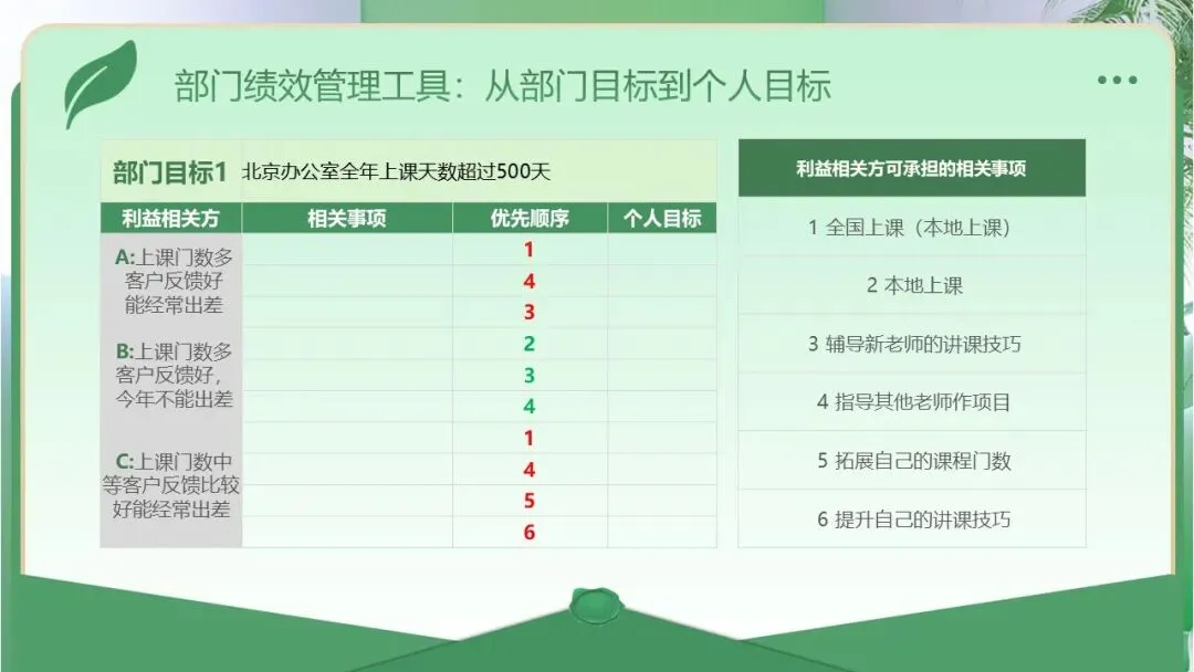 拆解个人目标时,要结合下属的能力和岗位职责,将部门目标拆解为每个下属的具体工作任务,明确“谁负责、谁配合、什么时候完成”,避免“人人有责,最后人人无责”的尴尬局面。