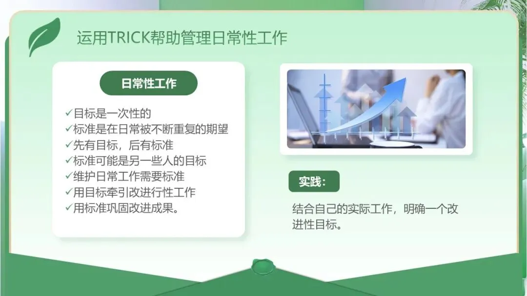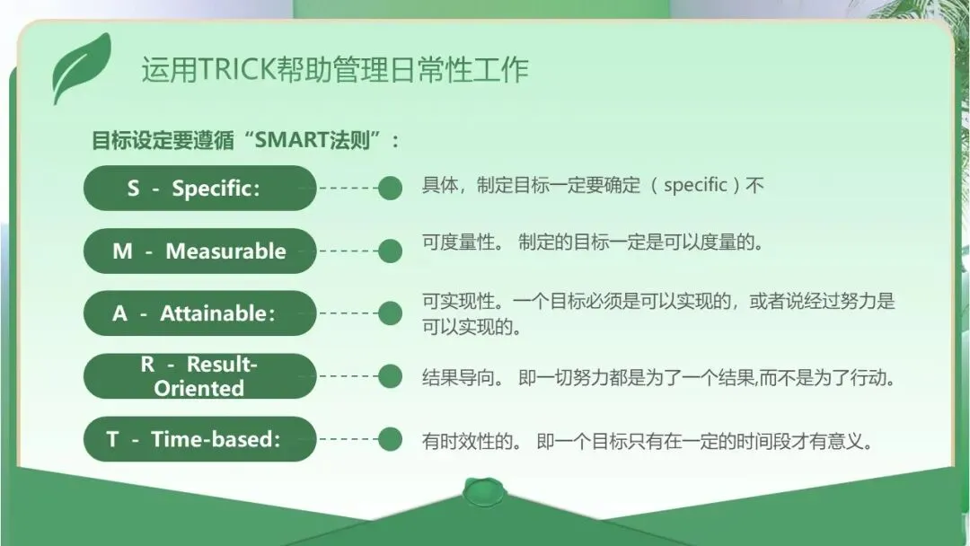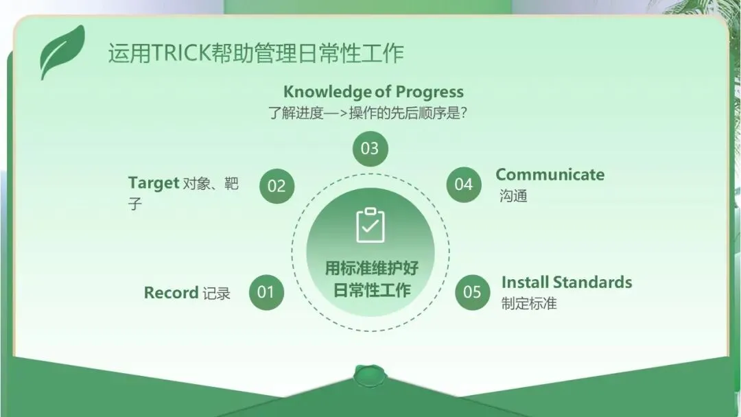 日常管理中,可借助工具提升效率:日常性工作用TRICK工具(记录、标准、对象、进度、沟通)维护,确保流程规范;改进性工作用SMART法则设定目标,以结果为导向,明确时间节点和考核标准。