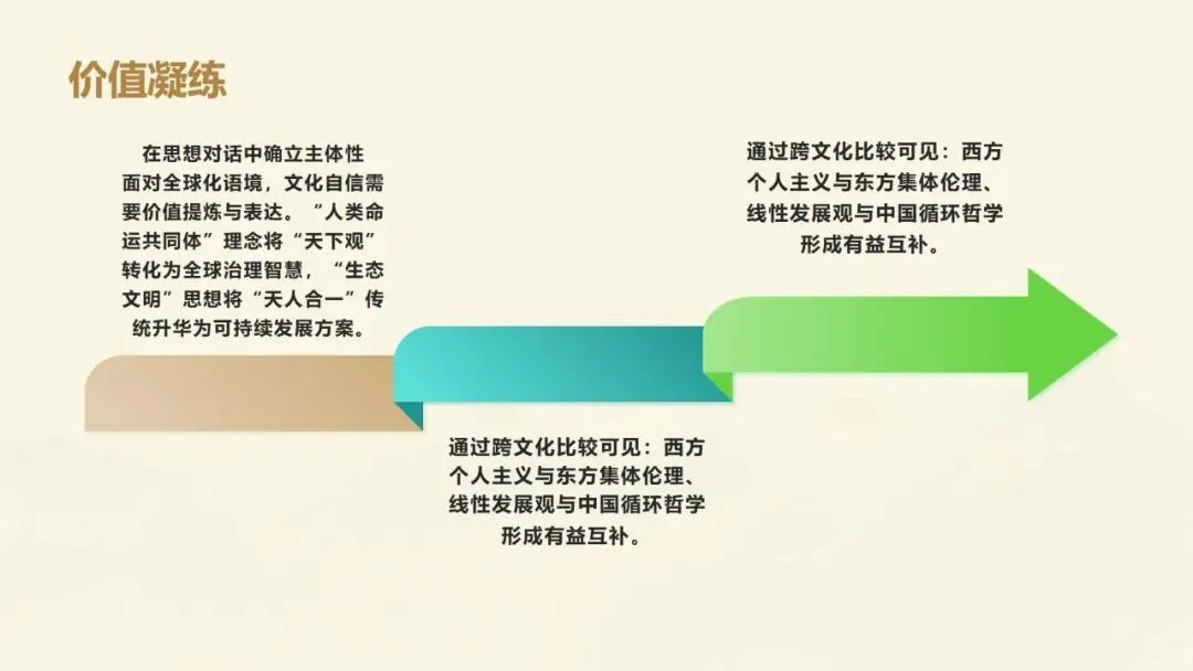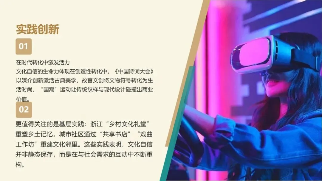 而《中国诗词大会》、国潮文创、乡村文化礼堂等实践,让传统与现代碰撞,让我深知:文化自信的生命力在于“活”,在回应时代需求中不断重构。全球化语境下,“人类命运共同体”“生态文明”等理念,让中国智慧转化为全球共识,这种不卑不亢的价值表达,既摒弃自卑,也超越狭隘;