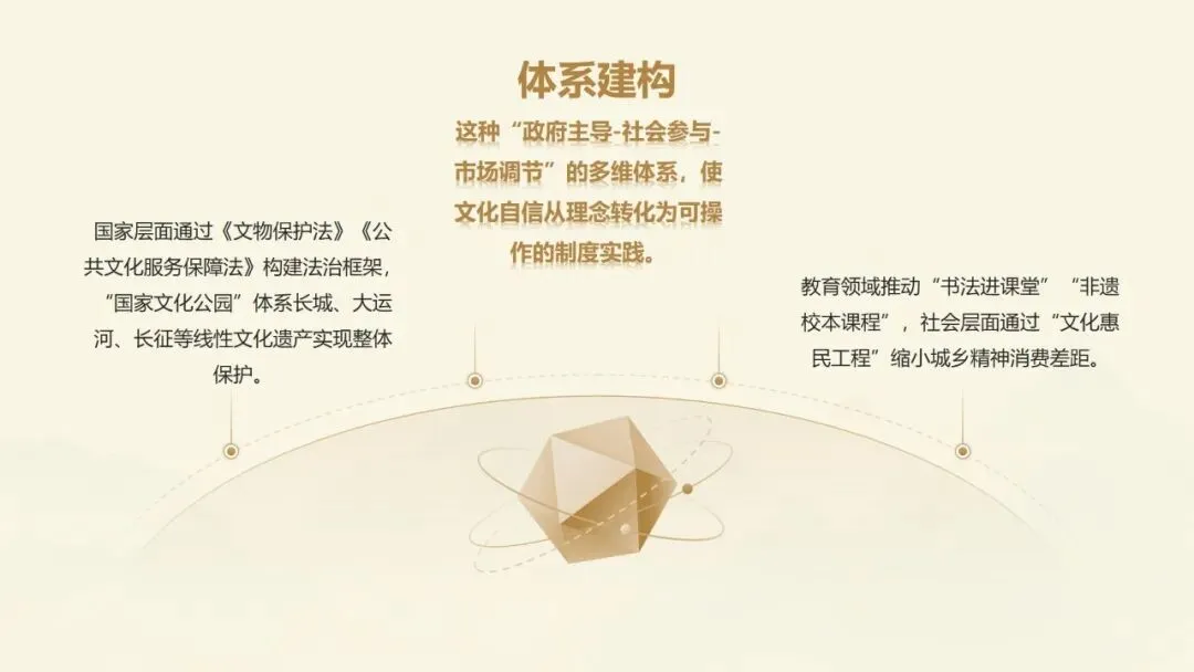 The institutional framework composed of laws and regulations, cultural projects, and educational popularization transforms abstract confidence into tangible practices accessible to all, which is the key reason why cultural confidence can resonate deeply with people. Genuine confidence cannot be separated from openness and inclusiveness. International research in Dunhuang studies and the global reach of online literature, through two-way mutual learning between civilizations, break down stereotypes, confirming the vision of "each beauty appreciating its own, and all beauties sharing harmony"—true confidence is never about "monopolizing excellence" but enriching oneself and achieving mutual success through exchange.文化自信是深根、茂枝、铸魂、强骨、展叶的生长过程,从文明积淀的“存量”转化为前行的“增量”。它藏在我们对传统的珍视、对创新的包容、对世界的善意中,终将成为照亮民族复兴之路的持久力量。