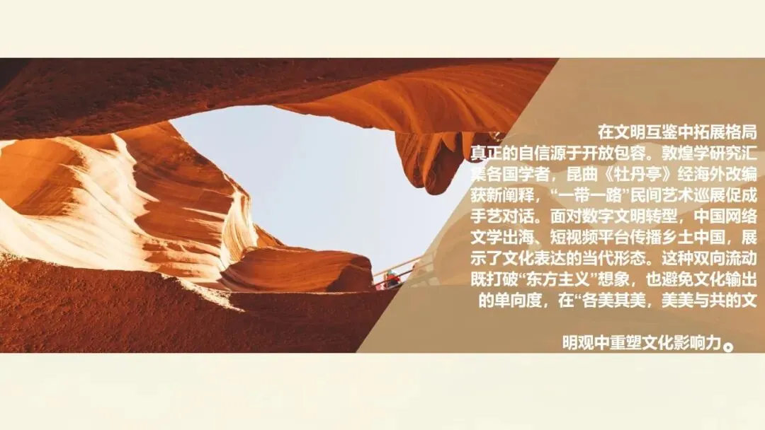 而法律法规、文化工程、教育普及构成的制度体系,让抽象的自信落地为全民可感的实践,这正是文化自信能深入人心的关键。真正的自信离不开开放包容。敦煌学的国际研究、网络文学出海,双向文明互鉴打破刻板印象,印证了“各美其美,美美与共”的格局——自信从不是“唯我独尊”,而是在交流中丰富自身、成就彼此。