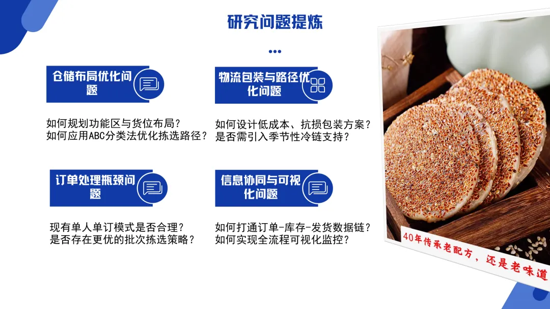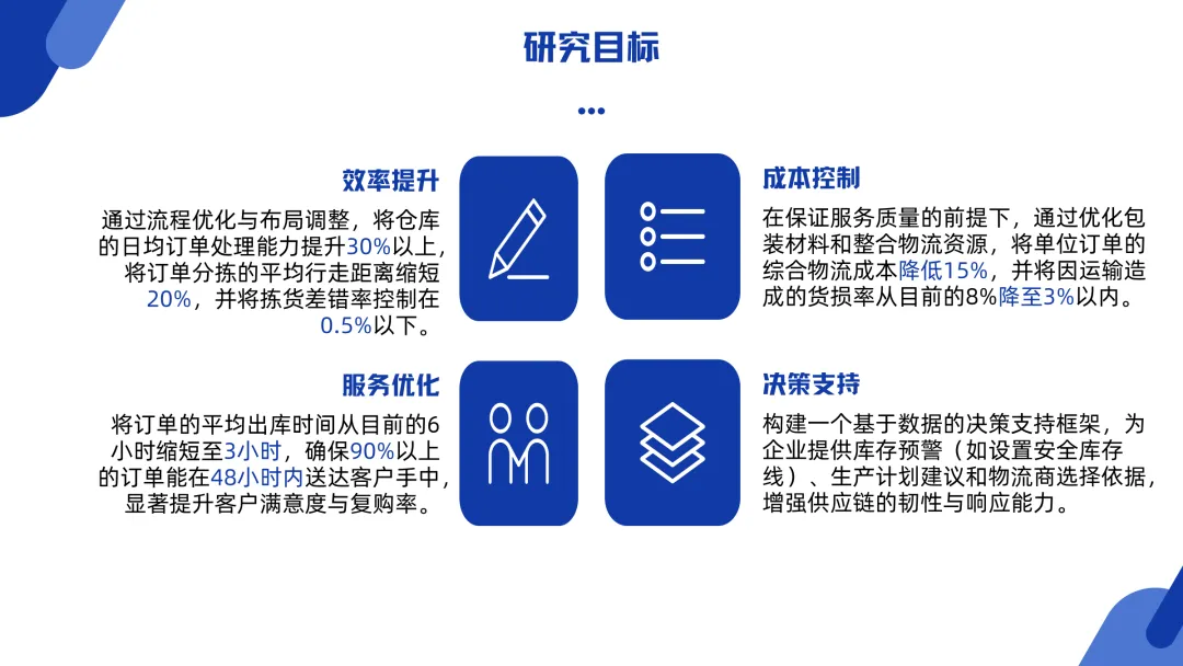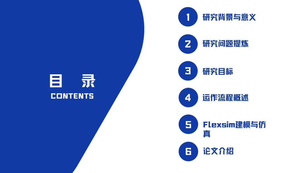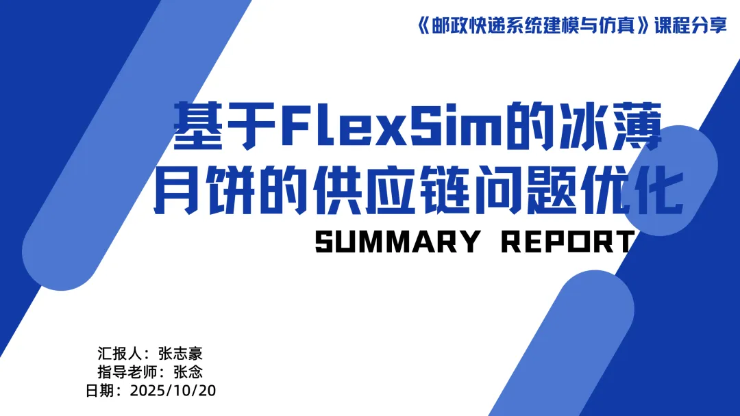 This PPT mainly introduces the research on optimizing the Kaizhou ice thin mooncake supply chain problem based on FlexSim simulation software. The content first explains the research background, pointing out that Kaizhou Bingbo faces challenges such as low warehousing efficiency, slow order processing, high logistics damage rate and opaque information in the process of e-commerce. It clarifies the research goals of improving efficiency and controlling costs by optimizing the warehousing layout and picking paths. At the same time, the PPT details the complete operation process from planned procurement, production quality inspection, warehousing and shelving to order processing, picking review, packaging and delivery, and delivery and receipt, laying a realistic foundation for subsequent simulation analysis.