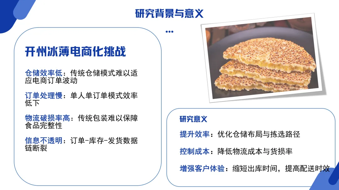 这个PPT主要介绍了基于FlexSim仿真软件对开州冰薄月饼供应链问题进行优化的研究。内容首先阐述了研究背景,指出开州冰薄在电商化过程中面临仓储效率低、订单处理慢、物流破损率高及信息不透明等挑战,明确了通过优化仓储布局与拣选路径以提升效率、控制成本的研究目标。同时,PPT详细梳理了从计划采购、生产质检、入库上架到订单处理、拣选复核、打包出库及配送签收的完整运作流程,为后续的仿真分析奠定了现实基础。