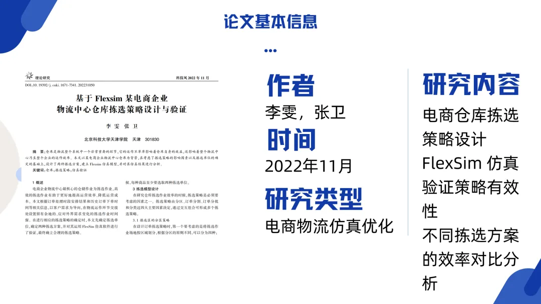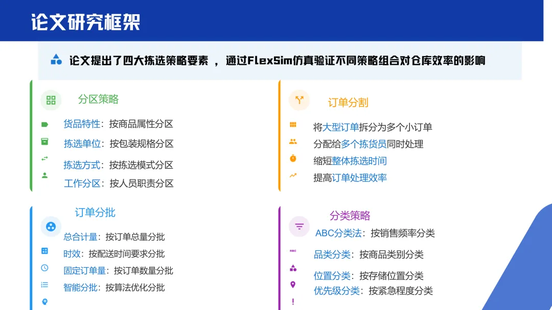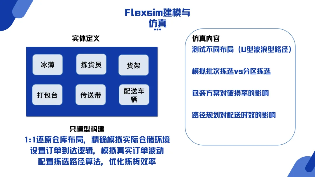 In the solution section, the PPT focuses on the application of FlexSim modeling and simulation. It plans to restore the warehouse layout 1:1, simulate order fluctuations and configure picking algorithms, and test the effects of different layouts (such as U-shaped, wave-shaped) and strategies such as batch picking and zone picking. In addition, the content also draws on a paper on the design of e-commerce warehouse picking strategies, analyzing in detail the four major elements of order segmentation, classification strategy, partition strategy and order batching. The PPT summary pointed out that applying the partitioning strategy and batching strategy in the paper, and using FlexSim simulation verification, can effectively solve the problem of low efficiency of "single person, single order" in Kaizhou Bingbo e-commerce warehousing, and significantly improve warehousing operation capabilities and customer experience.