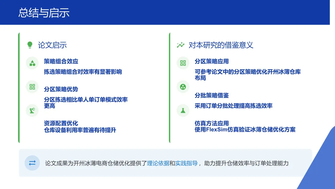 在解决方案部分,PPT重点展示了FlexSim建模与仿真的应用,计划通过1:1还原仓库布局、模拟订单波动及配置拣选算法,测试不同布局(如U型、波浪型)以及批次拣选与分区拣选等策略的效果。此外,内容还借鉴了一篇关于电商仓库拣选策略设计的论文,详细分析了订单分割、分类策略、分区策略及订单分批四大要素。PPT总结指出,应用论文中的分区策略和分批策略,并利用FlexSim仿真验证,能够有效解决开州冰薄电商仓储中“单人单订单”效率低下的问题,显著提升仓储运作能力与客户体验。