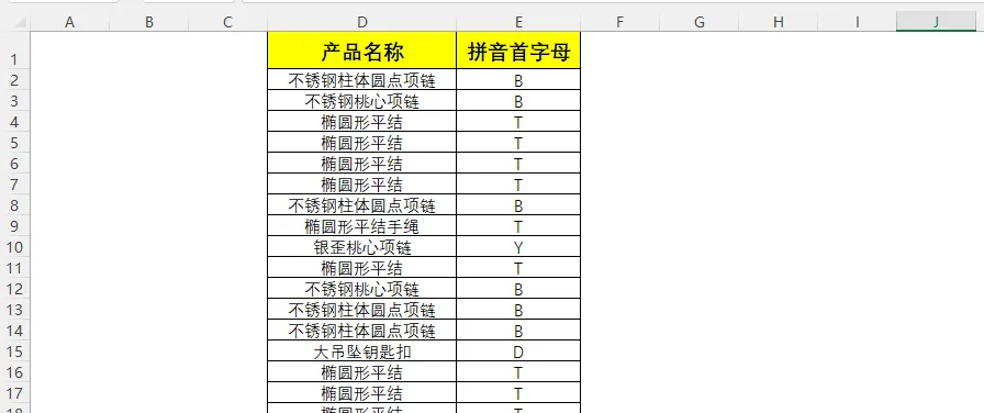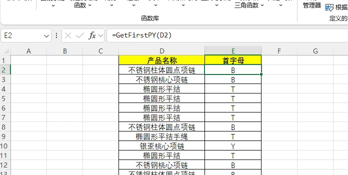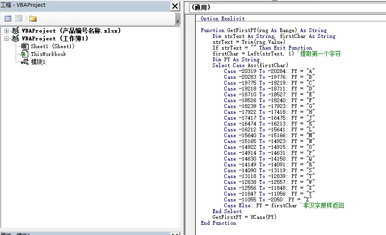 Function GetFirstPY(rng As Range) As StringDim strText As String, firstChar As StringstrText = Trim(rng.Value)If strText = "" Then Exit FunctionfirstChar = Left(strText, 1)Dim PY As StringSelect Case Asc(firstChar)Case -20319 To -20284: PY = "A"Case -20283 To -19776: PY = "B"Case -19775 To -19219: PY = "C"Case -19218 To -18711: PY = "D"Case -18710 To -18527: PY = "E"Case -18526 To -18240: PY = "F"Case -18239 To -17923: PY = "G"Case -17922 To -17418: PY = "H"Case -17417 To -16475: PY = "J"Case -16474 To -16213: PY = "K"Case -16212 To -15641: PY = "L"Case -15640 To -15166: PY = "M"Case -15165 To -14923: PY = "N"Case -14922 To -14915: PY = "O"Case -14914 To -14631: PY = "P"Case -14630 To -14150: PY = "Q"Case -14149 To -14091: PY = "R"Case -14090 To -13119: PY = "S"Case -13118 To -12839: PY = "T"Case -12838 To -12557: PY = "W"Case -12556 To -11848: PY = "X"Case -11847 To -11056: PY = "Y"Case -11055 To -2050: PY = "Z"Case Else: PY = firstChar '非汉字原样返回End SelectGetFirstPY = UCase(PY)End Function