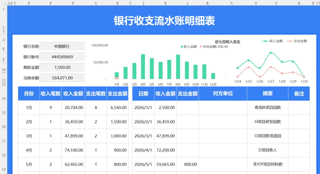 今天,分享一款功能清晰、公式智能的Excel “银行流水日记账模板” ,帮你自动统计、一目了然,实现高效对账!