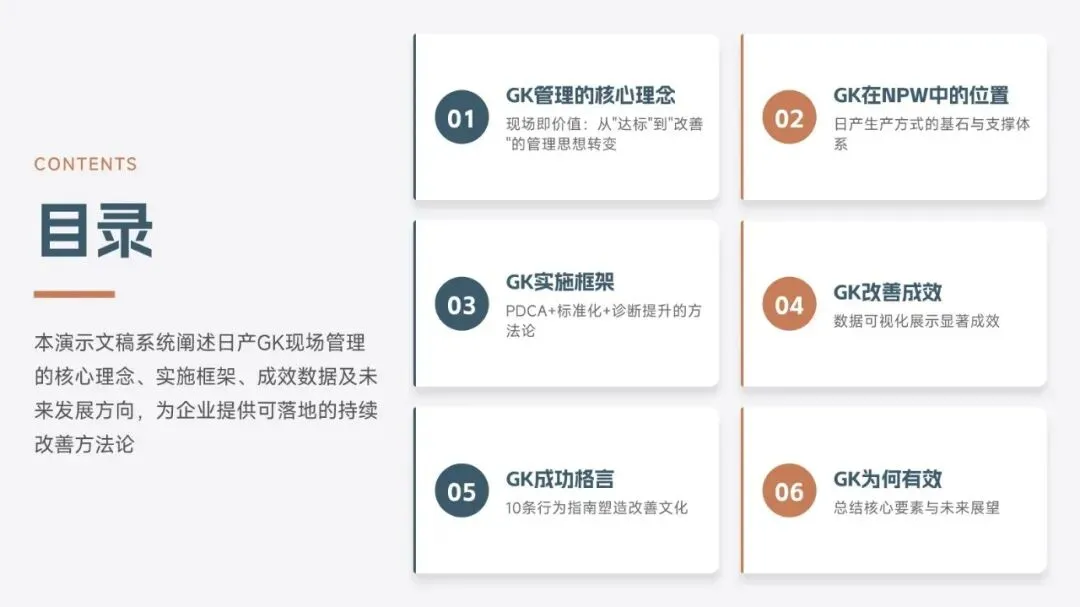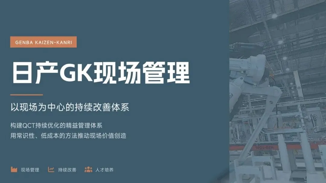 日产GK (GenbaKaizen-Kanri)的现场管理是以生产现场为中心,通过常识性、低成本的方式,不断进行改进的一种管理模式,其核心是实现“被动达标”到“主动改善”的转变,不断实现QCT (Quality、Cost、Delivery)水平的优化。
