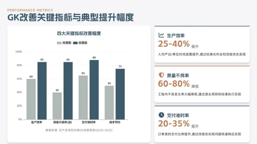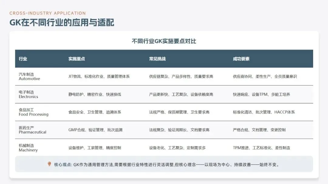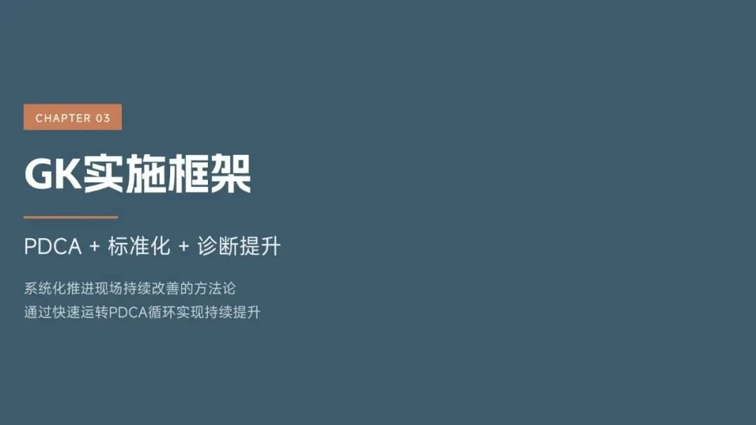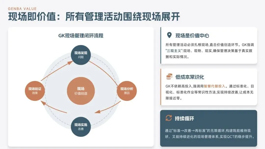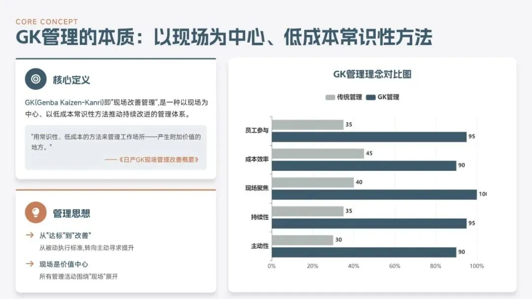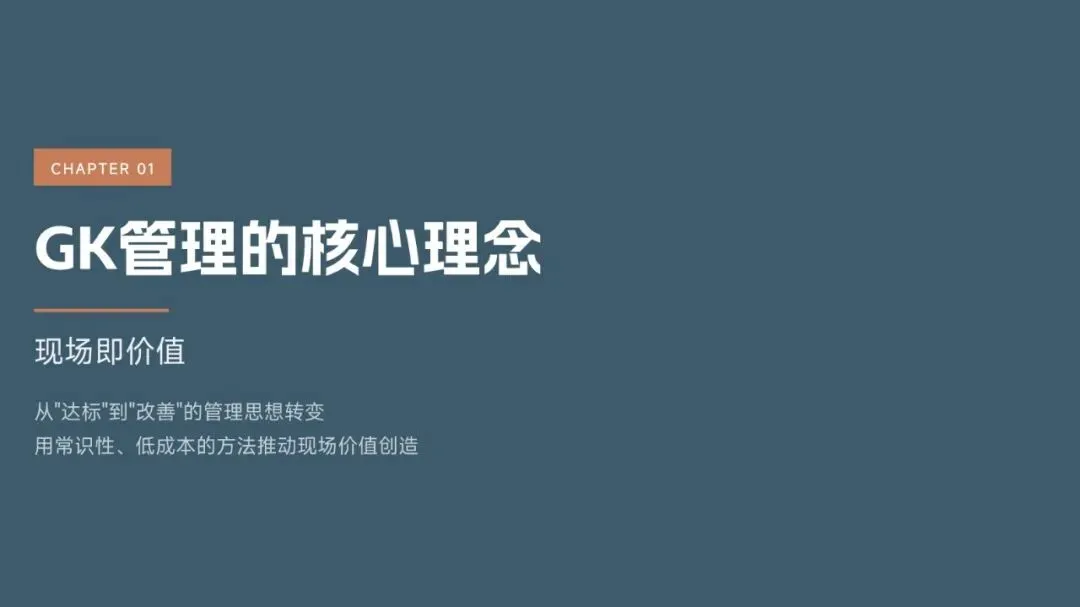 GK的核心理念非常清晰:以“现场”为创造价值的源泉,一切管理活动都应立足于“现场”、贴近“现场”、立足于“现实”,即所谓的“三现主义”。它不依靠高投资,而是以标准化、视觉化等简单实用的方式,以智慧取代代价,在「标准化」、「改进」、「再标准化」的循环中,使管理能在稳定的基础上,不断演进。与传统的管理方式相比, GK更加关注员工的参与度,成本效益和不断创新,在这些领域都取得了显著的领先。