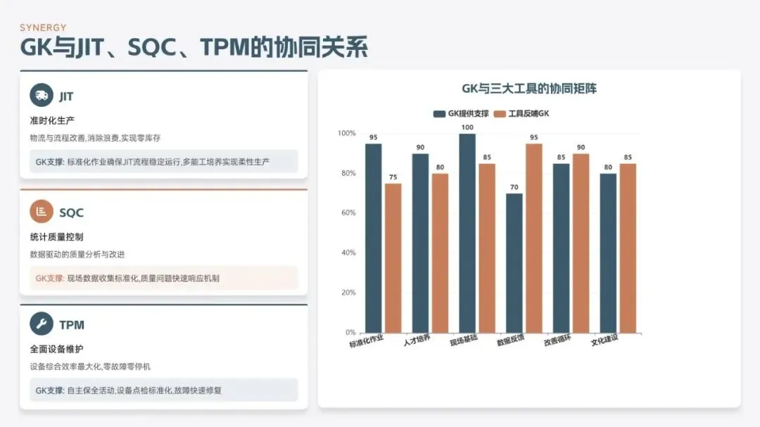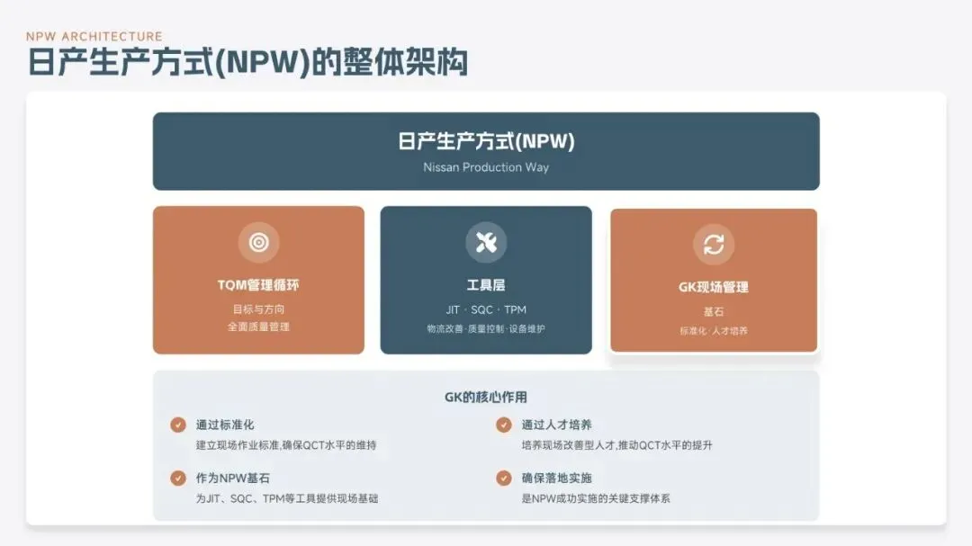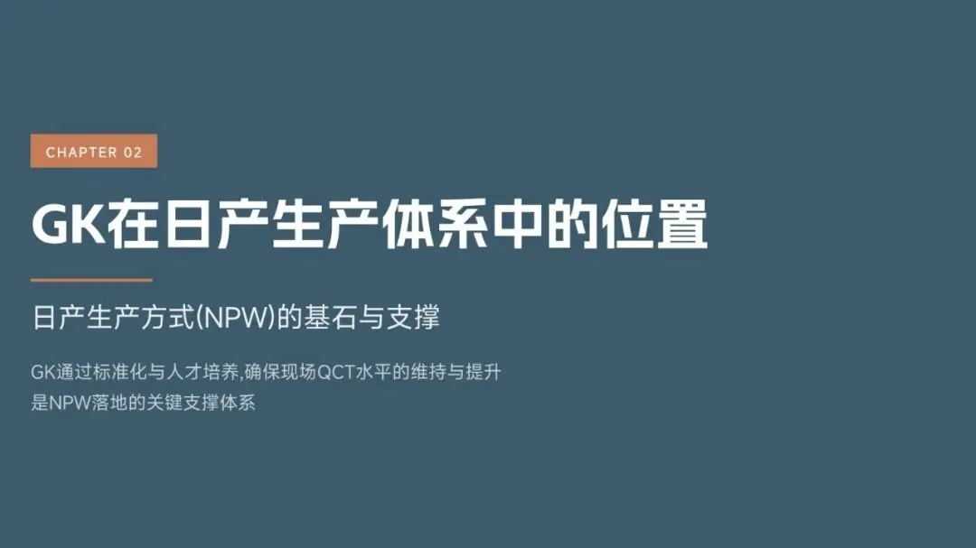 日产生产体系中, GK是当之无愧的中流砥柱.通过建立操作标准来保持质量控制,通过培养改进人才来推动质量提升,同时也为JIT、SQC、TPM等工具提供了现场支持——标准化操作使 JIT过程更加稳定,标准化数据采集帮助SQC对质量问题做出快速反应,标准化设备检查帮助 TPM达到零缺陷。
