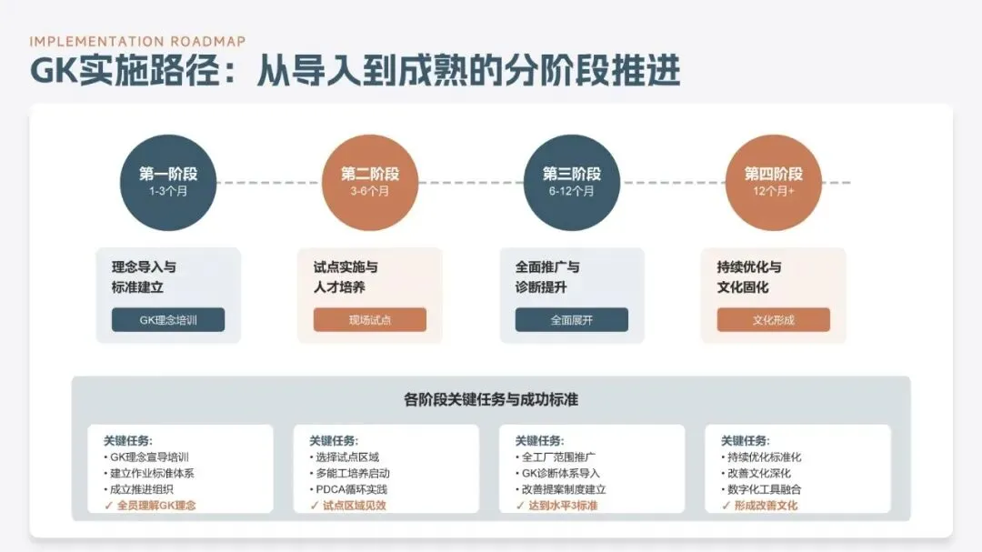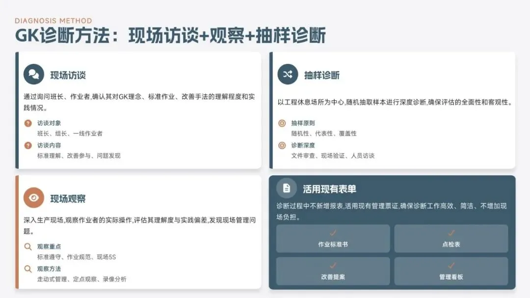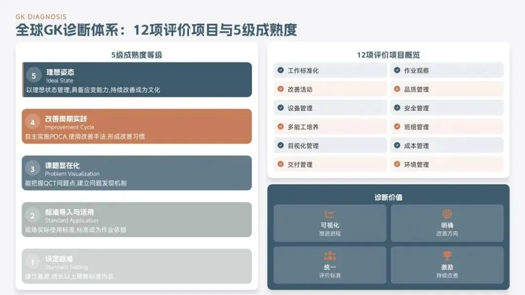 GK的实施思路是明确的:以PDCA循环推动改进,即调查现状,确定目标,落实执行,培训和调整,检验效果,总结经验,将有效的做法规范化,将遗留的问题转移到下一个周期。从12维度5成熟度的全球统一诊断系统,透过实地访谈、实地观察、实地抽样诊断等方式,明确改进方向,且不会对实地造成额外负担。