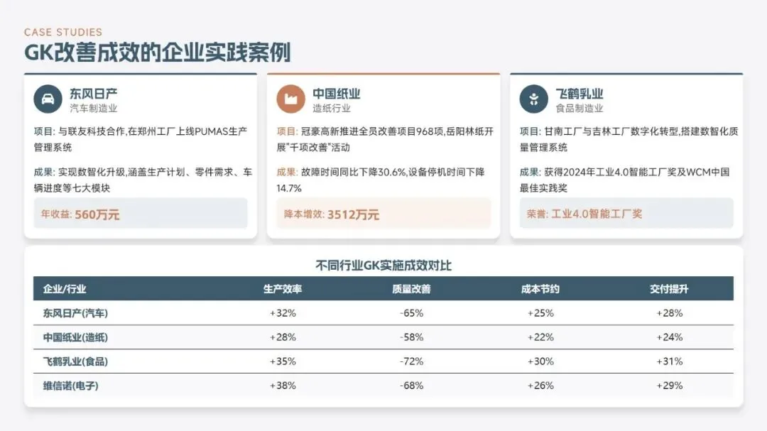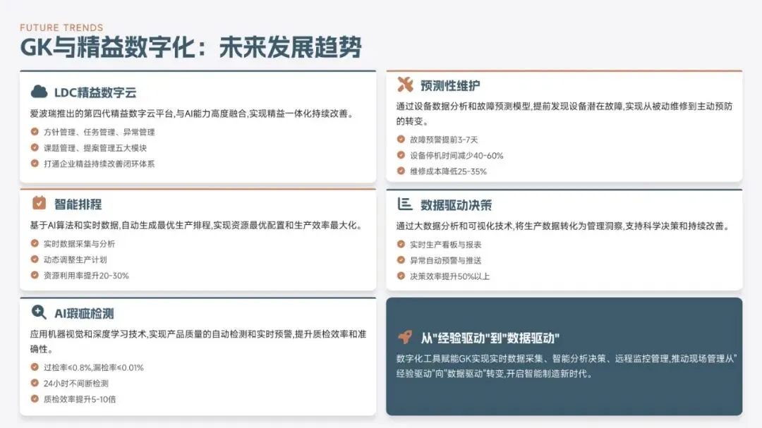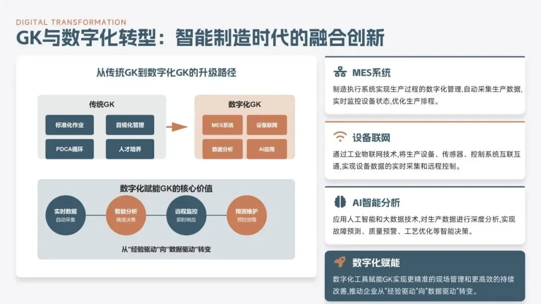 GK之所以能够成功,关键在于它抓住了降低成本、常识化、规范化和培养人才等几个关键因素。未来,它将进一步与数字化技术相结合,通过制造执行系统(MES)、设备联网(DeviceNet)、人工智能分析(AI Analysis)等技术,完成由“经验驱动”向“数据驱动”的转型。另外,该制度具有很强的适应性,汽车、电子、食品、医药等,都可以根据自己的特点,调整执行的重点。