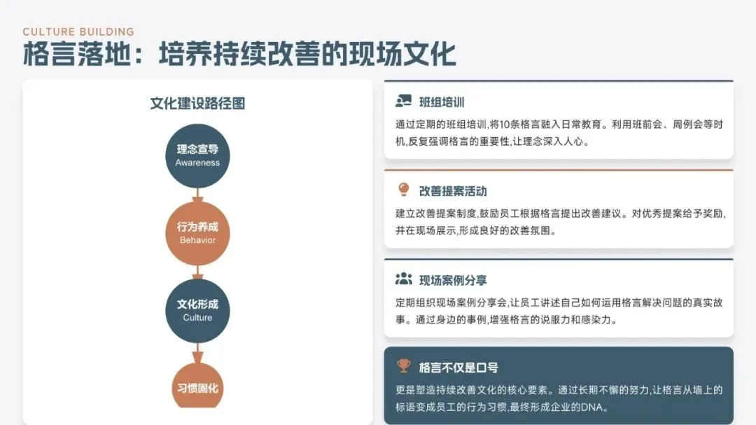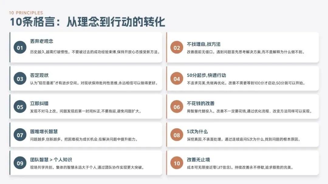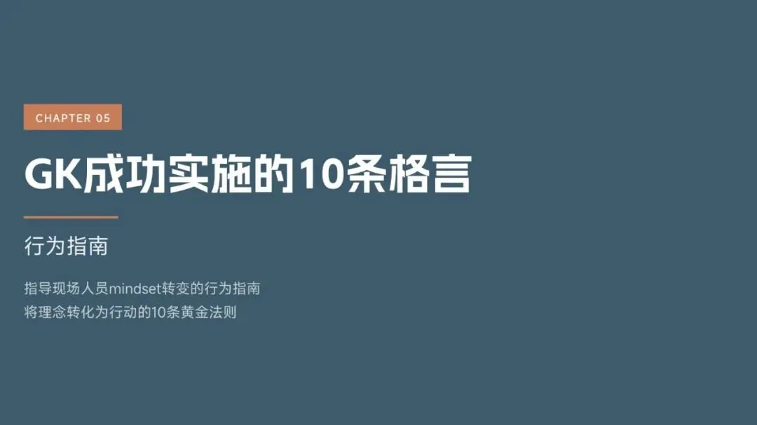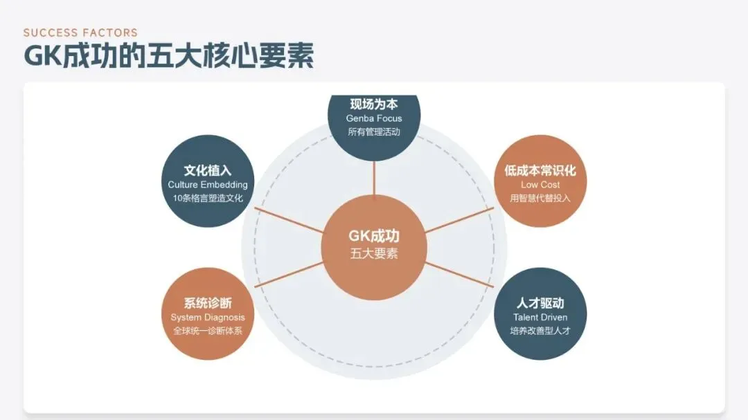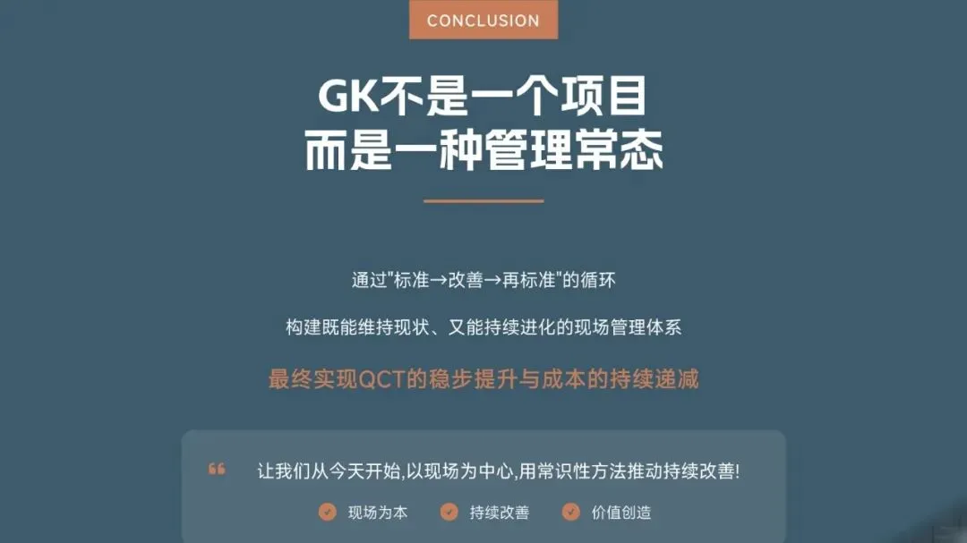 GK的10大成功信条,如“摒弃旧思想”、“不找理由,找方法”、“5次为什么”,并不需要挂在墙上,而是要通过团队培训、改进建议、案例交流,让大家每天都能身体力行,成为企业文化的一部分。