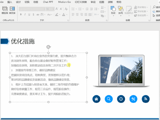 除了能一键对齐文本,PPT 还具备一键排版文本的功能。比如下面这段文字,共有 3 点。首先,我们调整一下文本的层级,选中正文内容,点击上方【段落】中的【提高列表级别】,正文内容便会缩进。