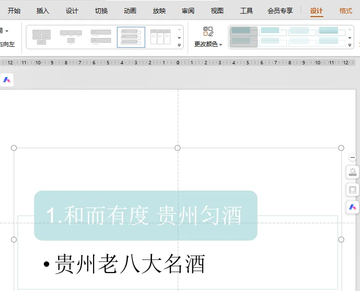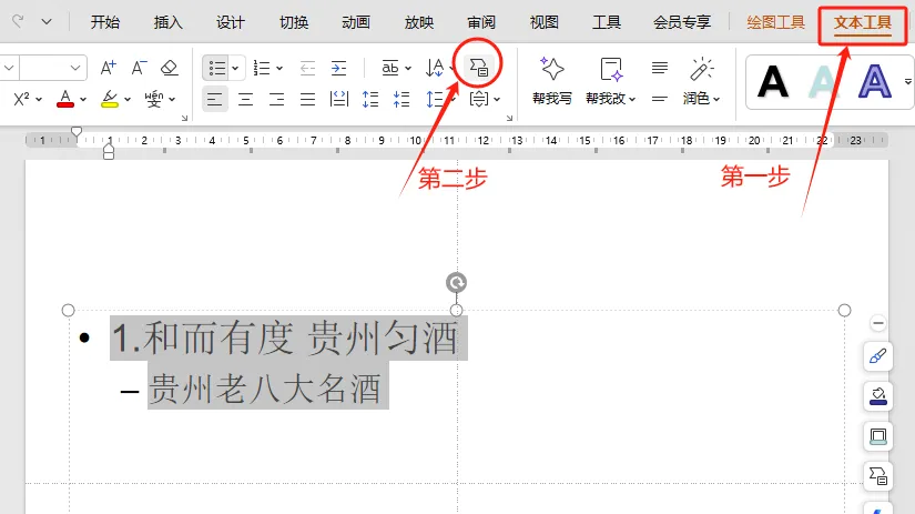 选中文本之后,点击右上角的【文本工具】,再点击【图形转换】,等待样式转换结束点击【更换样式】,再选择【SmartArt】图形转换,即可完成。
