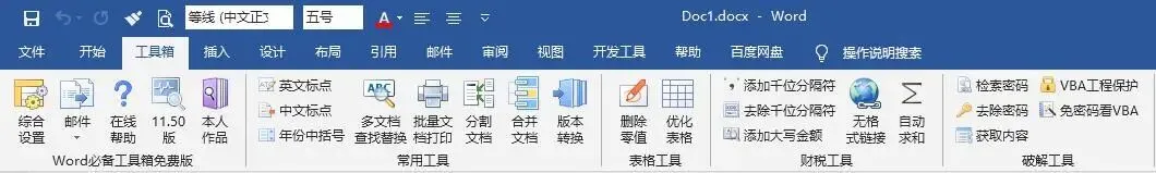 一款免费无广告,专注于文档文字处理辅助工具插件。现有版本接入AI工具,可调用VBA轻松实现文档的一键智能自动化处理。另外,该工具可智能识别办公软件版本及系统环境,自动屏蔽已存在的功能。当然,付费类工具就不在此帖引申。此为功能无限制版,基本能满足日用需求。