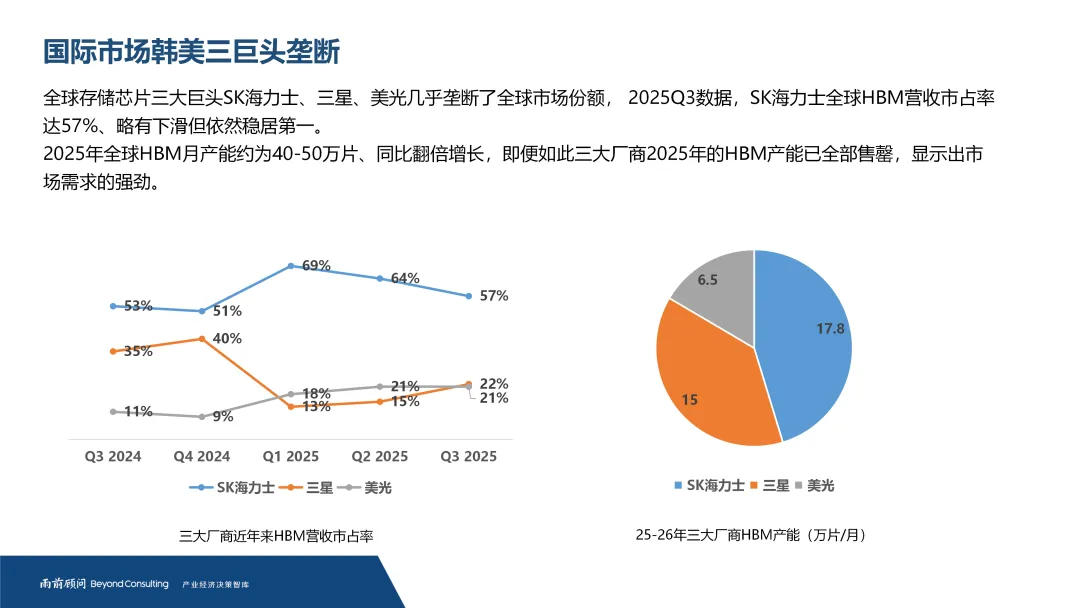 当前HBM市场呈现高度集中的产业格局。SK海力士、三星、美光三家巨头几乎垄断全球市场,其中SK海力士市占率持续领先。尽管各大厂商产能持续翻倍增长,但2025年产能仍被预订一空,反映出供需关系的极度紧张。随着AI芯片需求持续攀升,HBM市场预计将以年复合增长率超35%的速度高速扩张。
