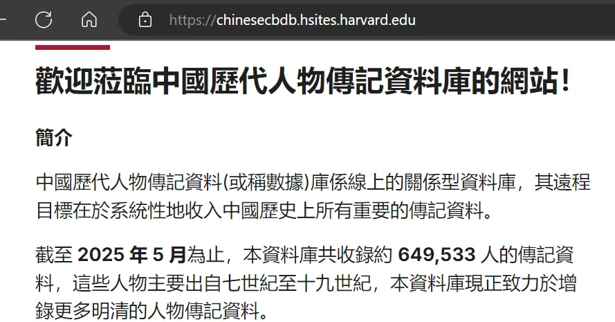 哈佛大学官网提供了中国历代人物传记资料库,目前包含七世纪到十九世纪约65万人的资料。