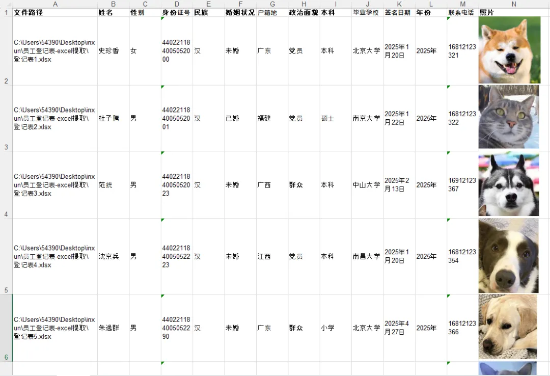 1、提取表格中的姓名、民族、政治面貌、性别、婚姻状况、最高学历、身份证号、户籍地、毕业学校、联系电话、照片。