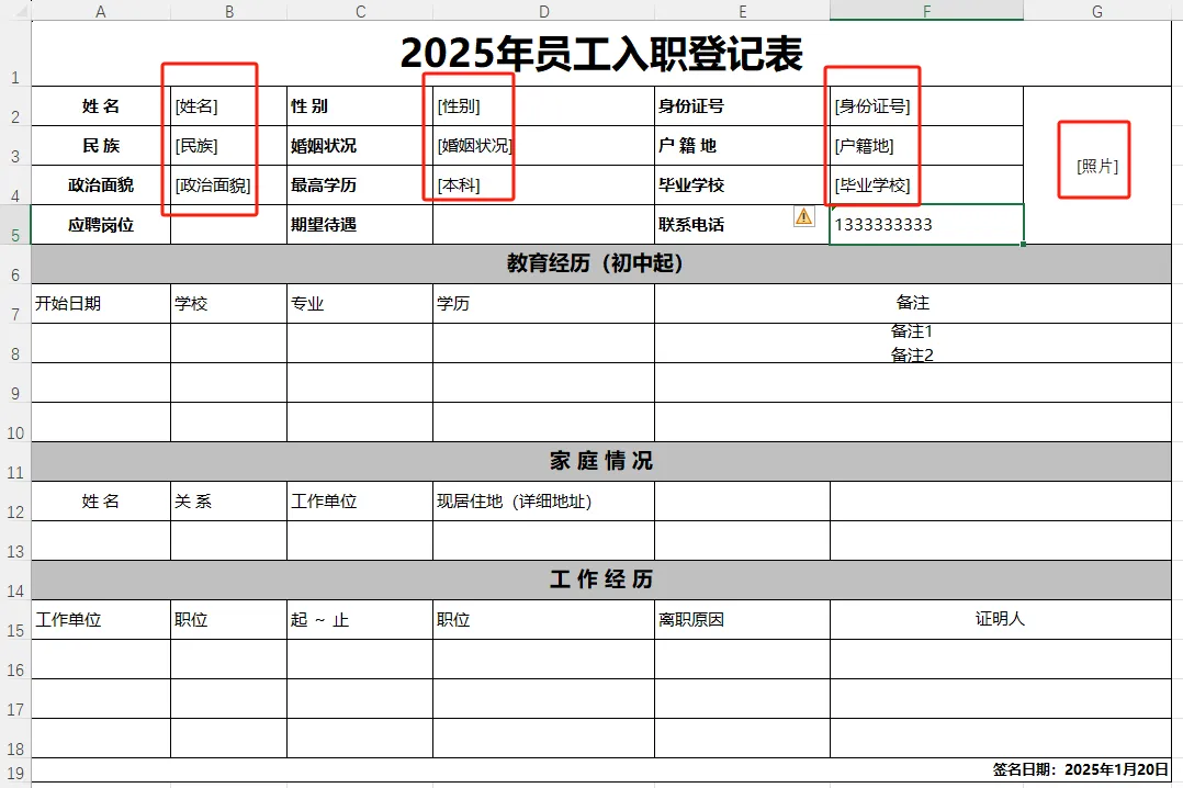 这里注意红色框框的内容就是我们修改的内容,我们将这些单元格或者段落用占位符代替,占位符用英文输入法状态下的中括号[]包裹。这些单元格对应的内容就会被提取到 Excel 文件中,并且会以中括号内的占位符作为提取后的 Excel 表头名称。