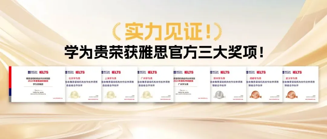 深耕留学领域数年,学为贵不仅连续9年成为雅思官方白金级合作伙伴,获得过“雅思机考贡献奖”和“年度集团贡献奖”极具含金量的雅思官方奖项。
